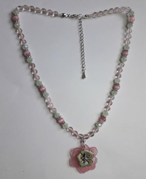 The necklace is made up with 4mm pale pink translucent glass beads with 4 groups of beads each side, consisting of 2 faceted very pale green beads either side of a rose pink cats eye bead.