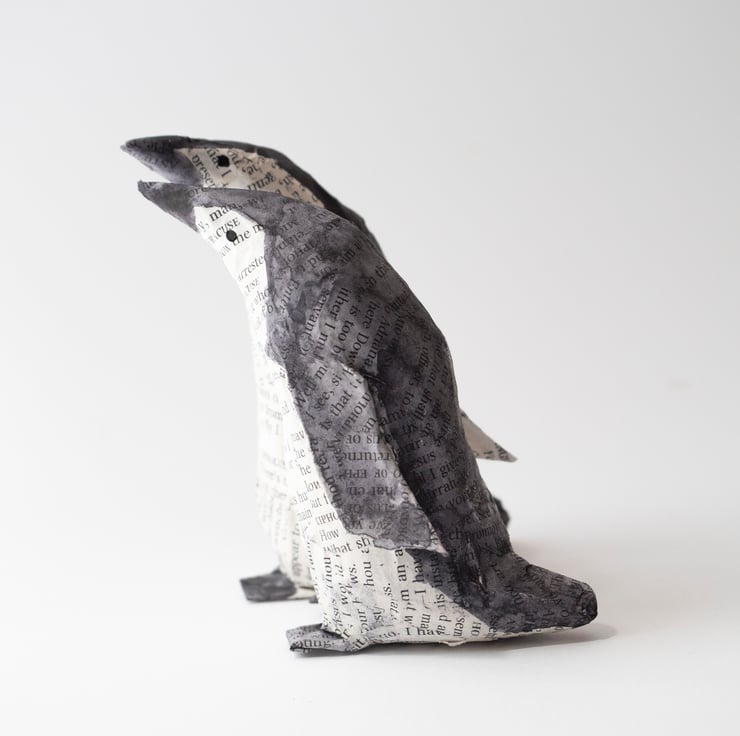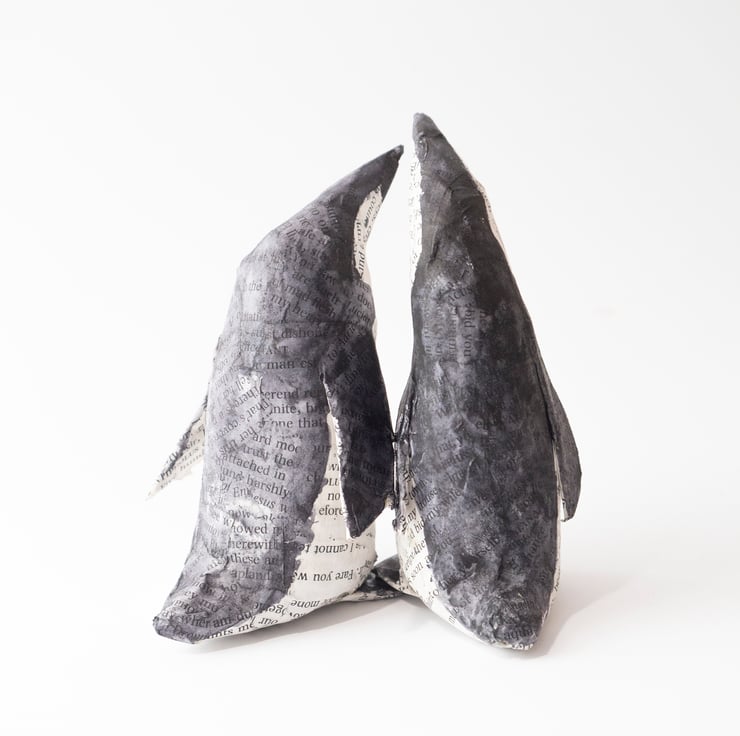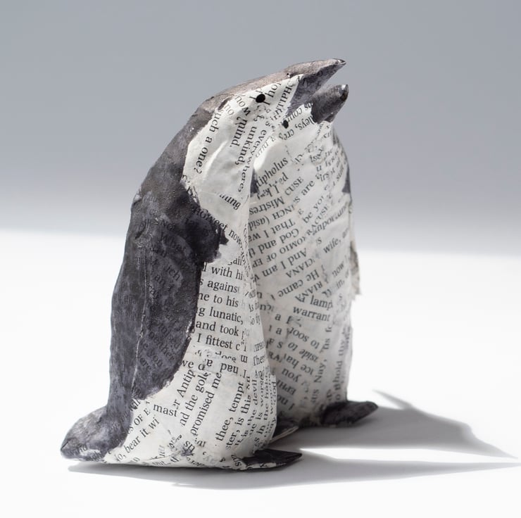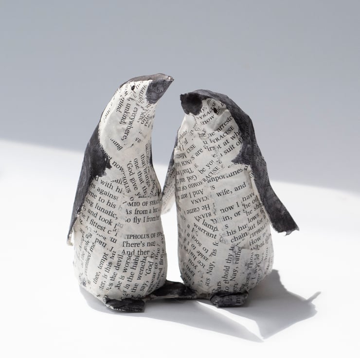 A handmade paper mache folk art sculpture of a pair of penguins. It is created from paper mache using book paper, wire and watercolour and is approx 9cm high. Made with newspaper, wire, glue, pages from Shakespeare, and watercolour paint.