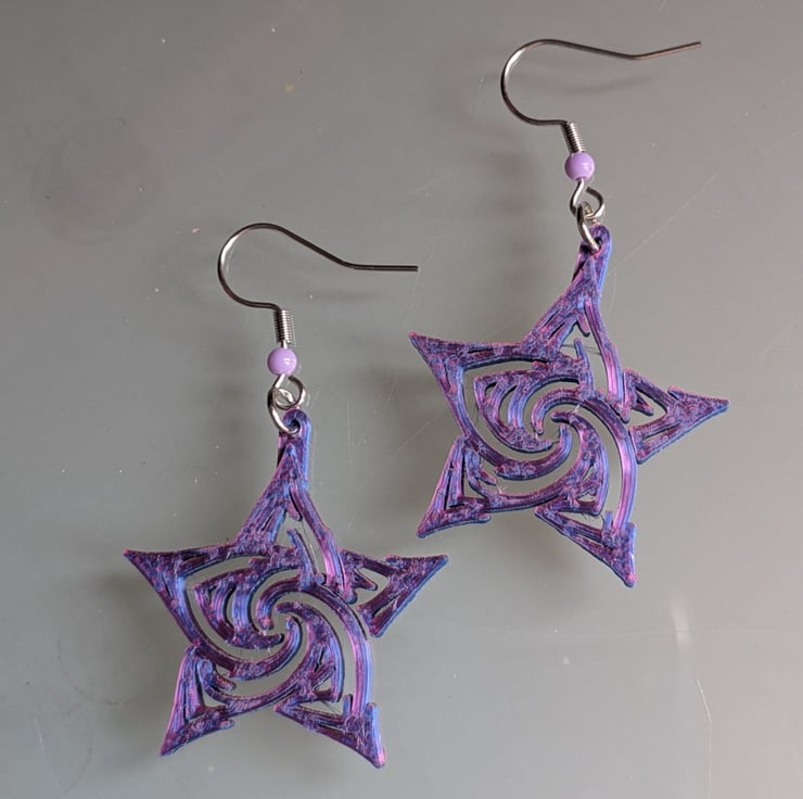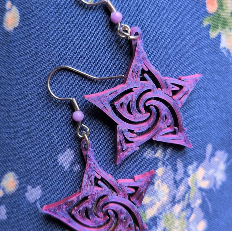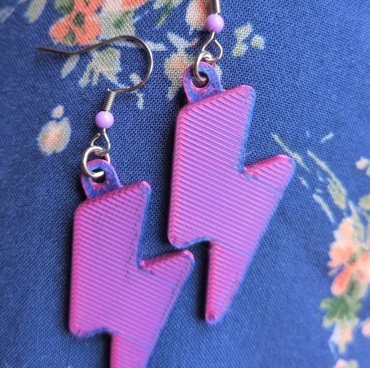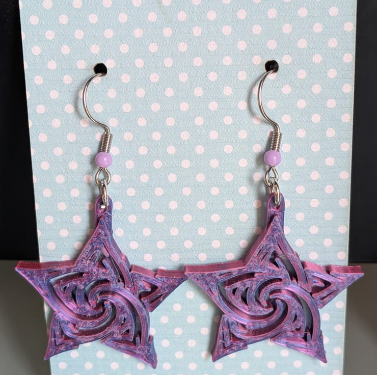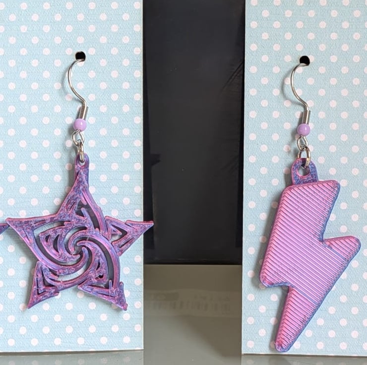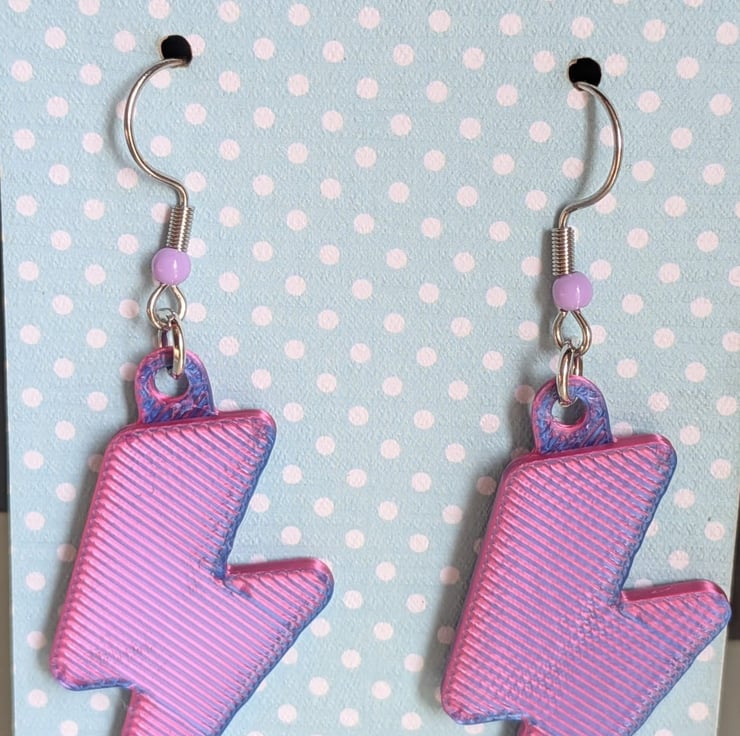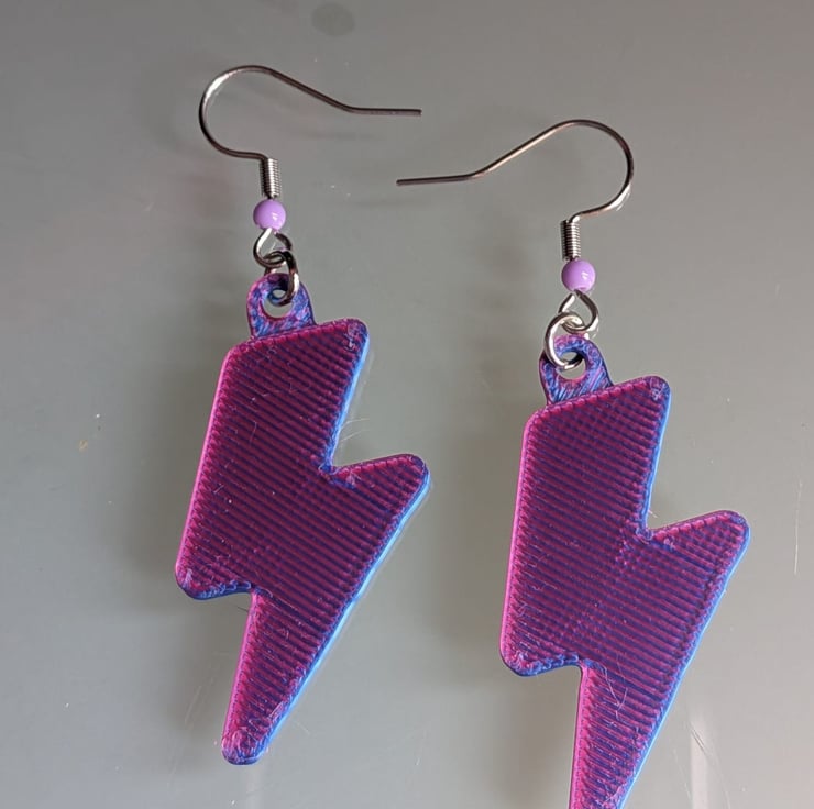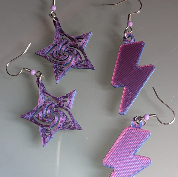 They are 3D printed in purple PLA silk filament. Both have a lilac bead on the earring finding which is silver tone metal.