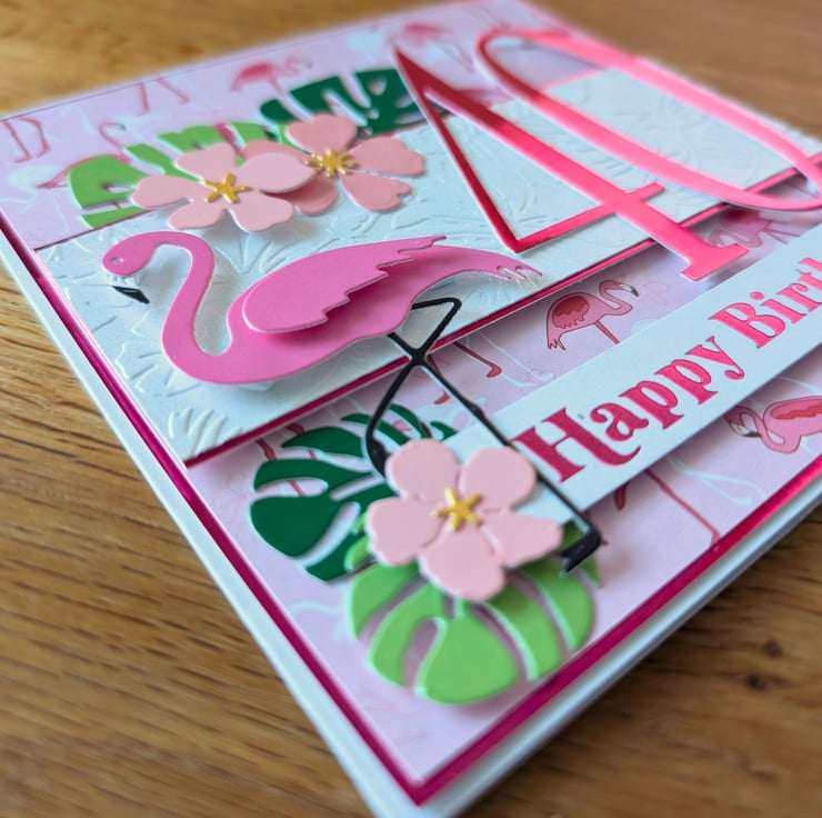 The card features pretty flamingo print paper, a white pearlised embossed stripe holding the die cut flamingo, leaves and flowers, a hand foiled 'Happy Birthday' greeting and your choice of age digitally cut from pink mirri card.