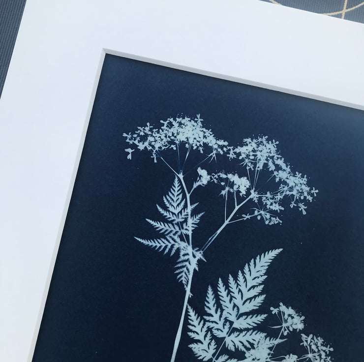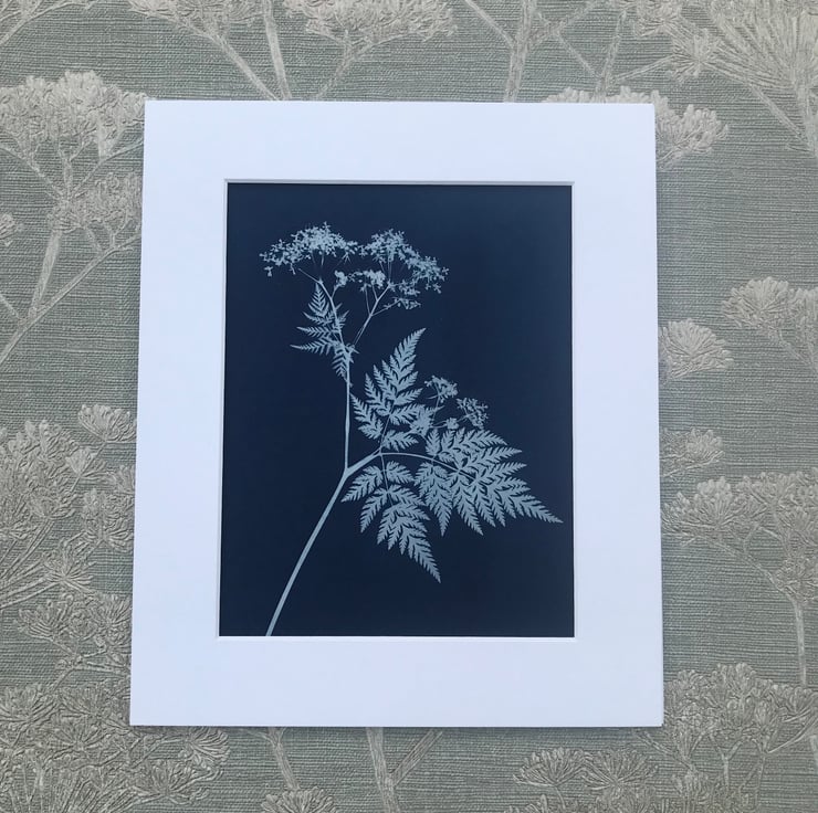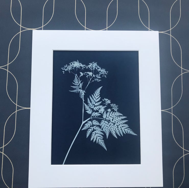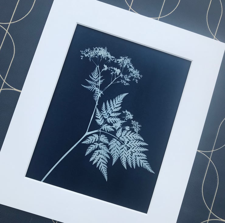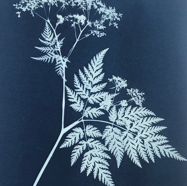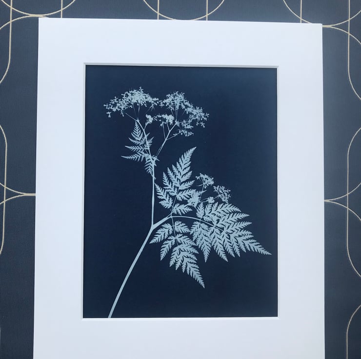 Botanical Art- Take a drive through the English countryside in early summer, you're sure to see Cow Parsley growing thick and fast along the hedgerow, a great source for the early pollinators. The flowers and leaves both press well, making it a perfect plant for Cyanotype. Detailed, cut-edged leaves and soft flower umbels rise off spiky stalks. An almost navy background shows off the pretty pressed botanical in the palest blue in this Original Cyanotype.