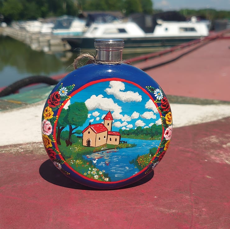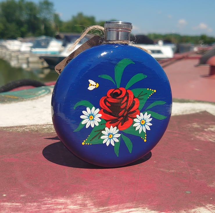 Hand painted in the traditional folk art style of the Rose and Castle Artwork of the boaters, this hip flask would make a perfect gift. There is a detailed castle scene on the front and a larger rose on the back.