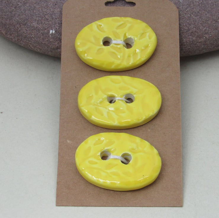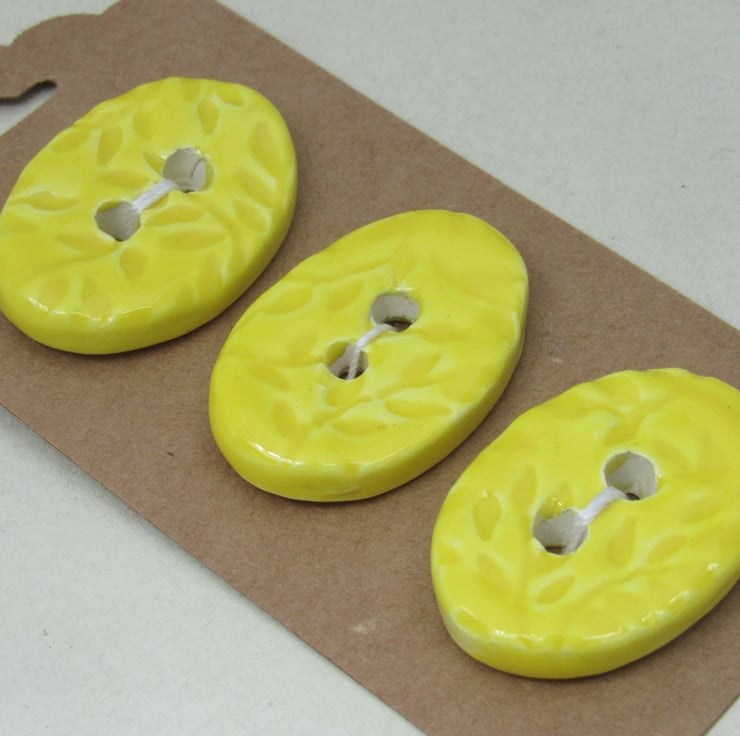 3 medium sized stoneware buttons, with a pretty leaf sprig motif printed into the upper face. Finished with a bright lemon yellow glaze.