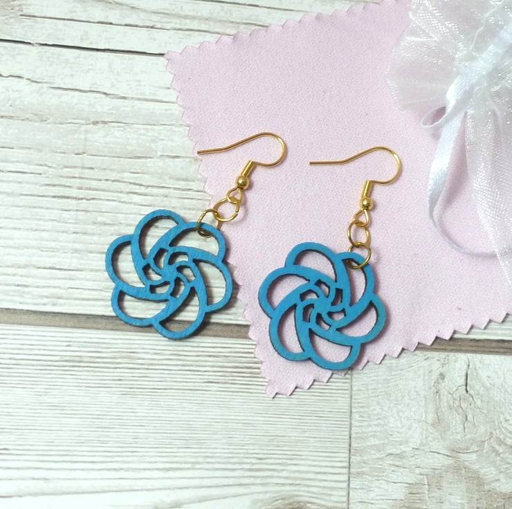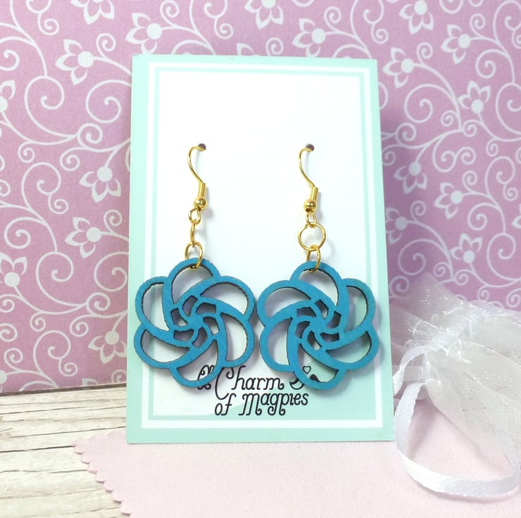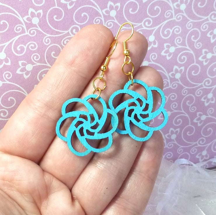 Lasercut blue wooden earrings, eco-friendly wood earrings stained with bright blue dye. Lightweight and comfortable to wear, the wires are hypoallergenic gold plated Stainless Steel. They are supplied with small silicone stoppers so they're not accidentally lost.