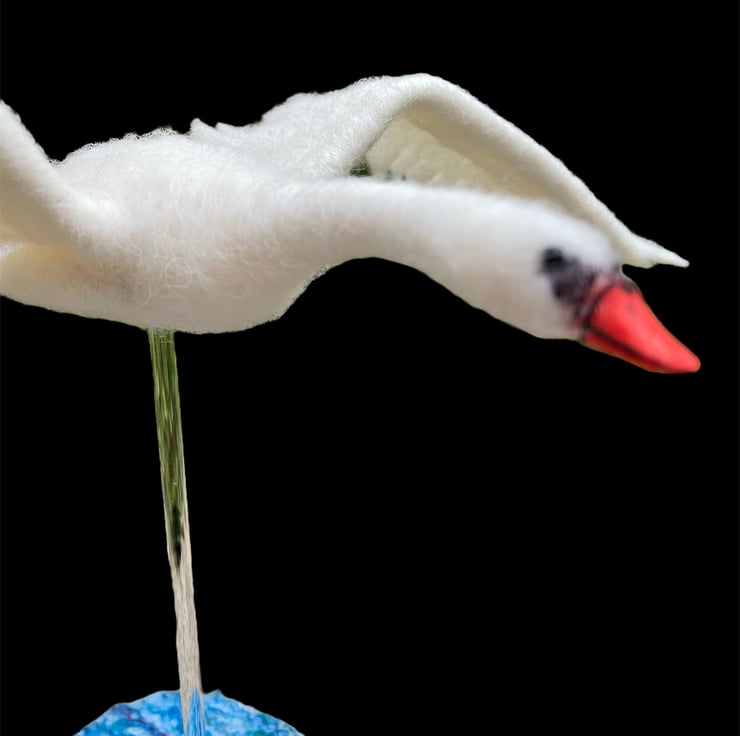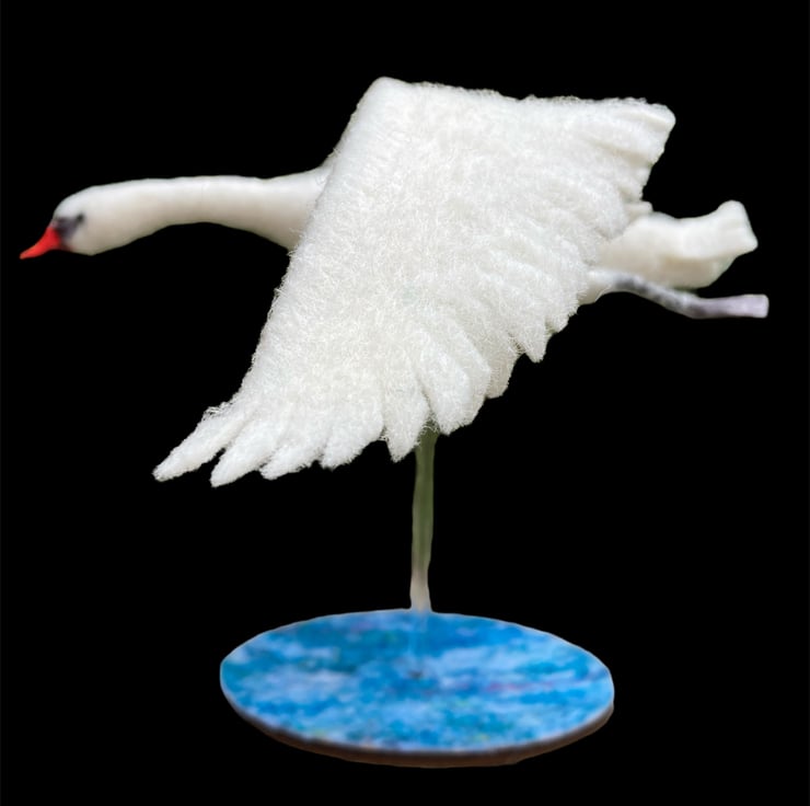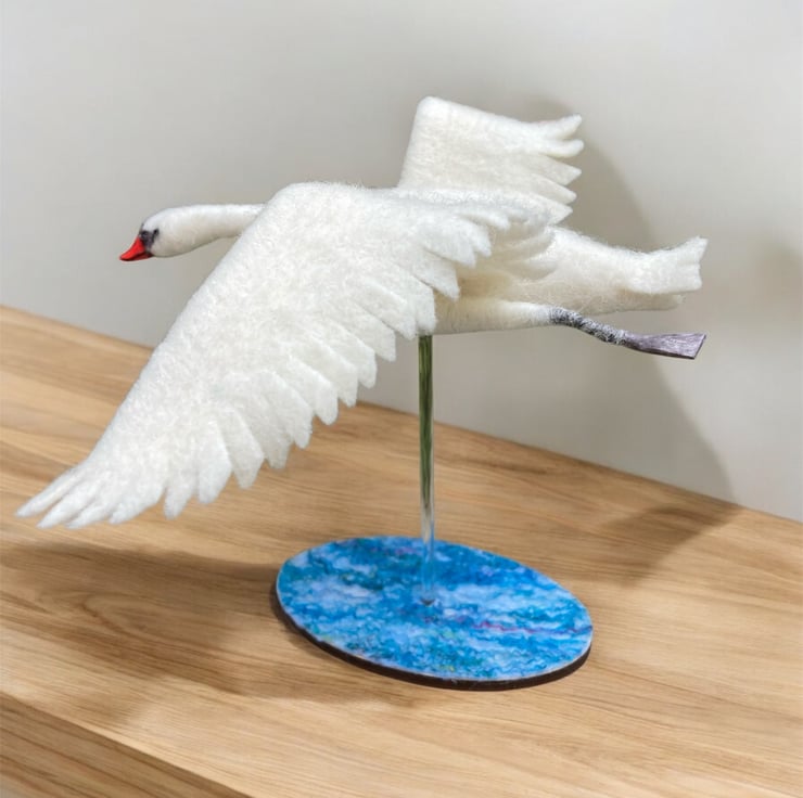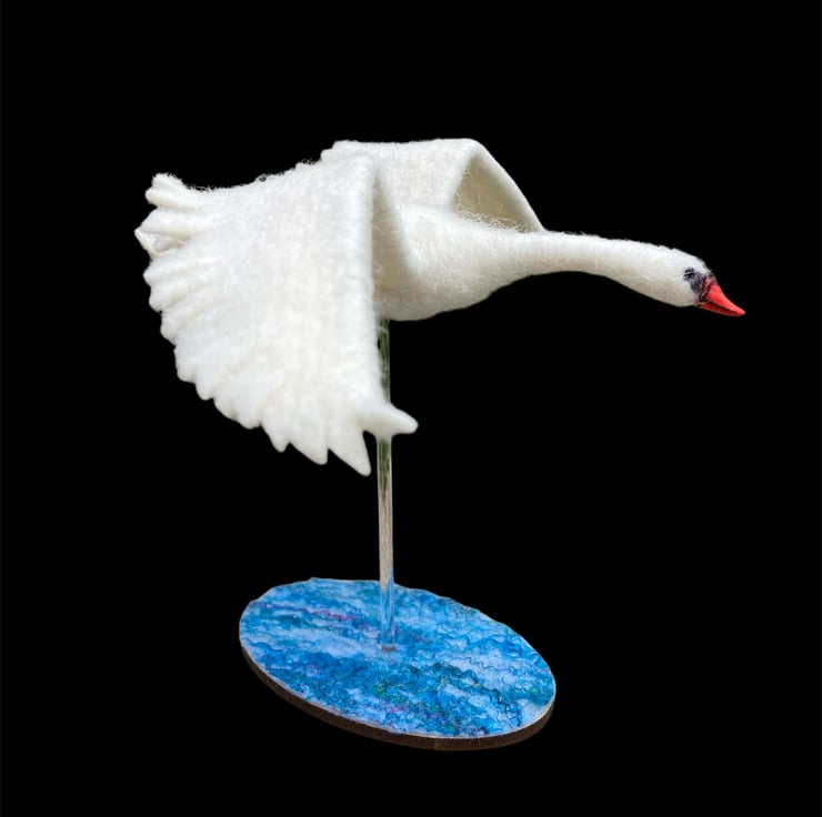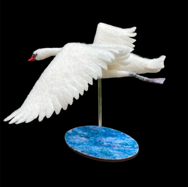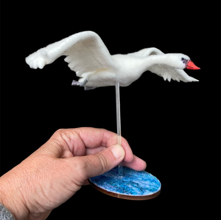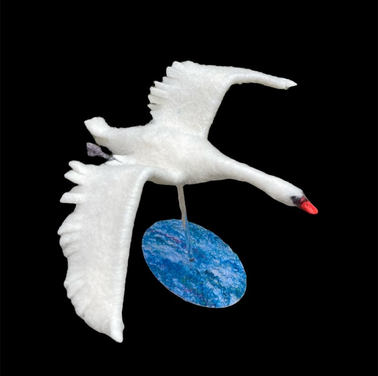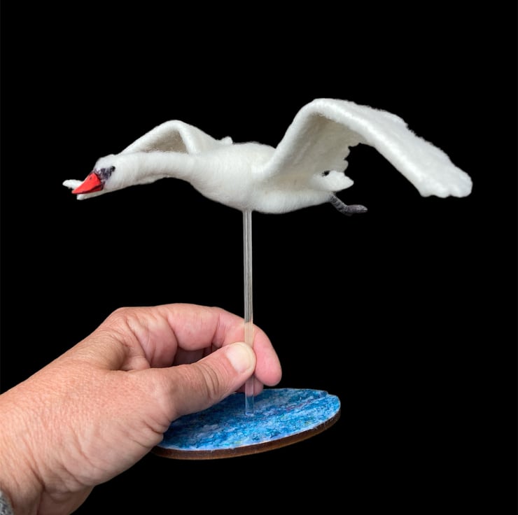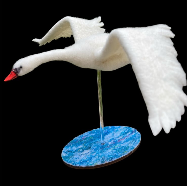 This sculpture of a handsome mute swan flying has been needle felted using woollen fibres. White woollen fibres have been sculpted using a barbed felting needle which binds the fibres together and shapes the body The feet, made from air dry clay have been coloured and attached using wire covered in woollen fibres to create the legs. The wings have been cut from a piece of hand made flat felt, the leading edge has been wired allowing the wings to be gently posed as required. Finally, the beak is made using silk clay , hand coloured to add the appropriate markings and attached to the head. Small black beads have been added for the eyes.