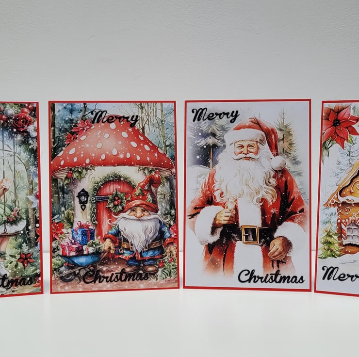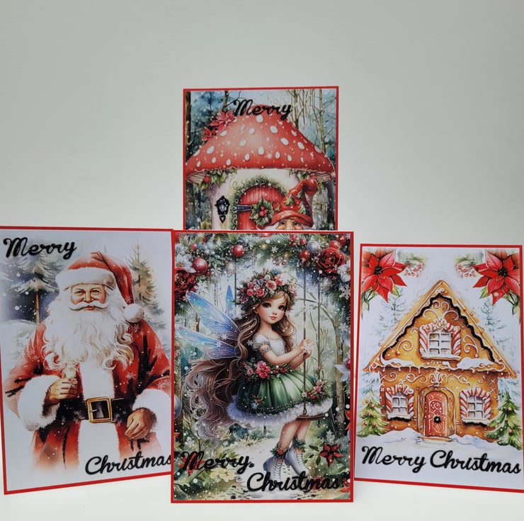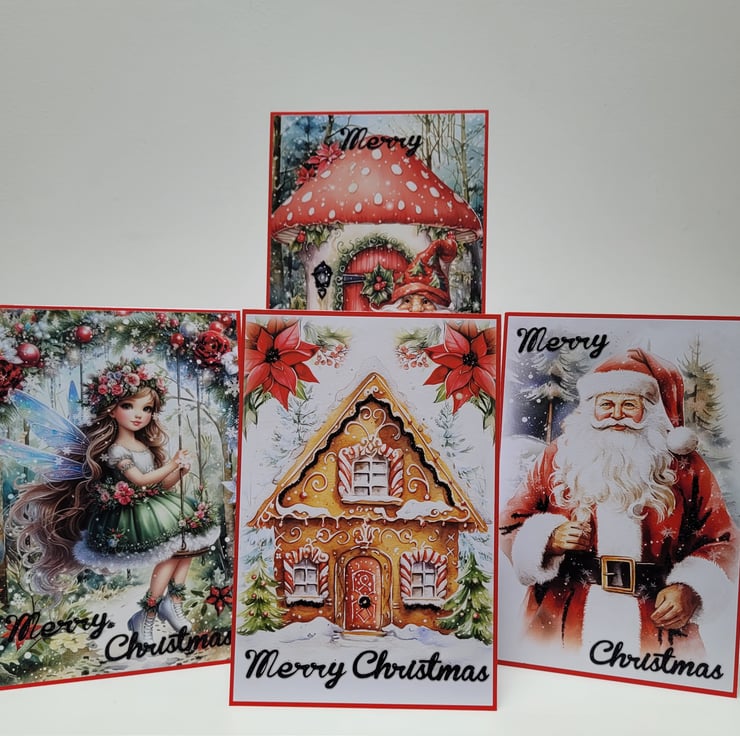A lovely set of 4 handmade Christmas cards featuring images of a Fairy, Gingerbread House, Gnome and Toadstool, and of course Father Christmas - all printed on 150GSM silk finish paper.