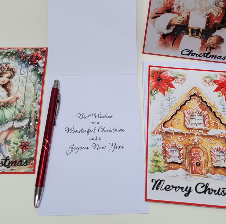 The cards all measure 4 x 6 inches, each contains a stamped sentiment which reads "Best wishes for a wonderful Christmas and a joyous new year", and are supplied with plain white envelopes.