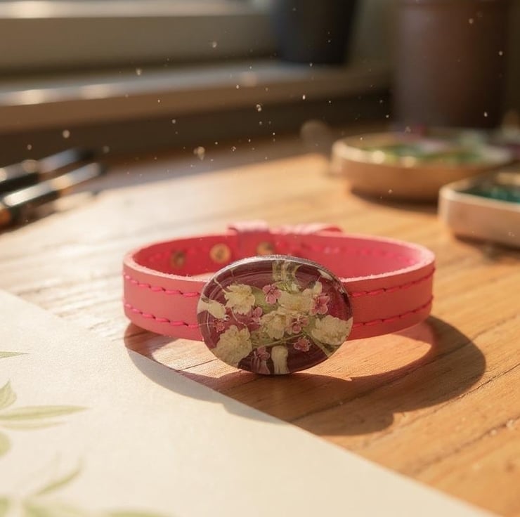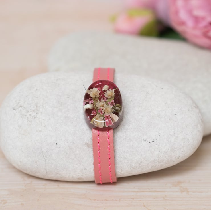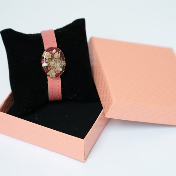 This pretty bracelet has a soft pink leather strap and a removable oval resin charm in the middle. The charm is made of resin and filled with real dried flowers in pink and white tones. It’s light, comfortable, and easy to wear every day.