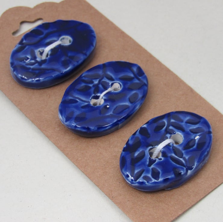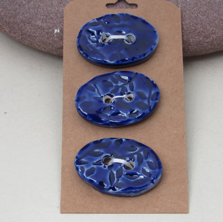3 medium sized stoneware buttons, with a pretty leaf sprig motif printed into the upper face.