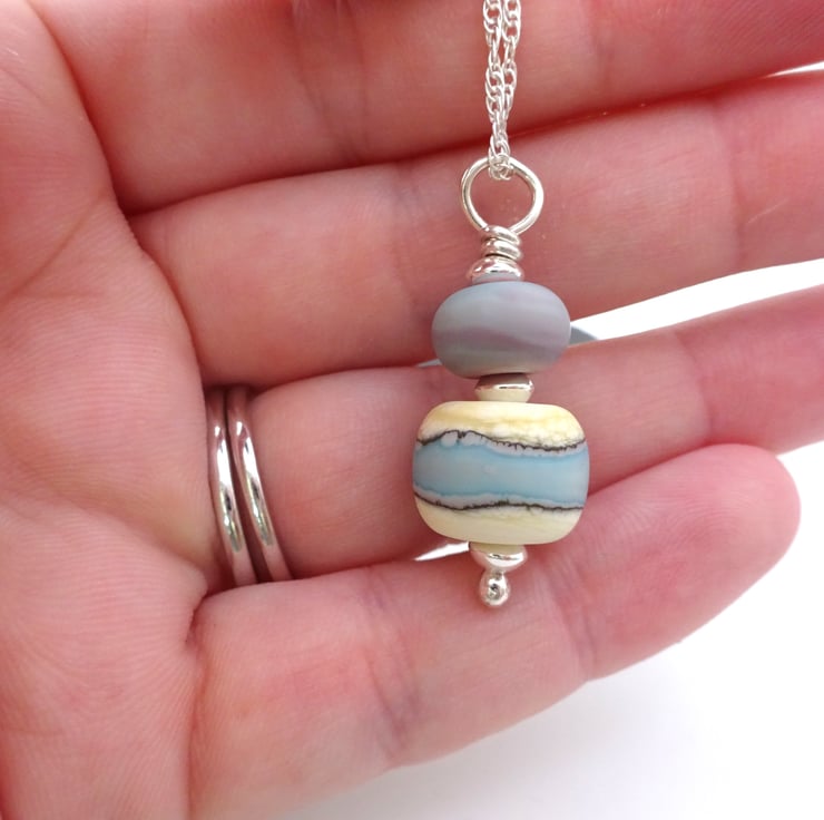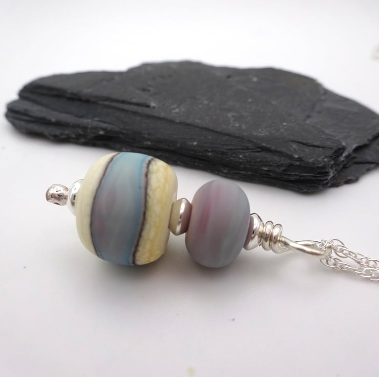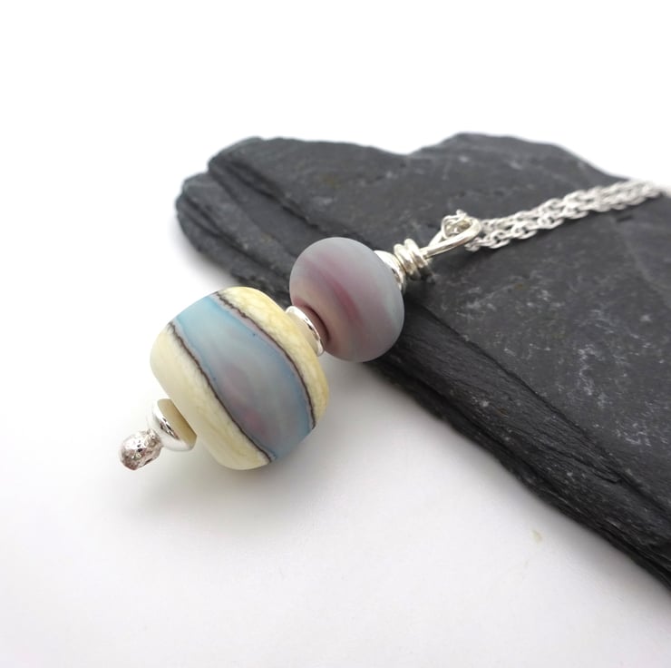 A sterling silver chain which features a handmade lampwork glass pendant.