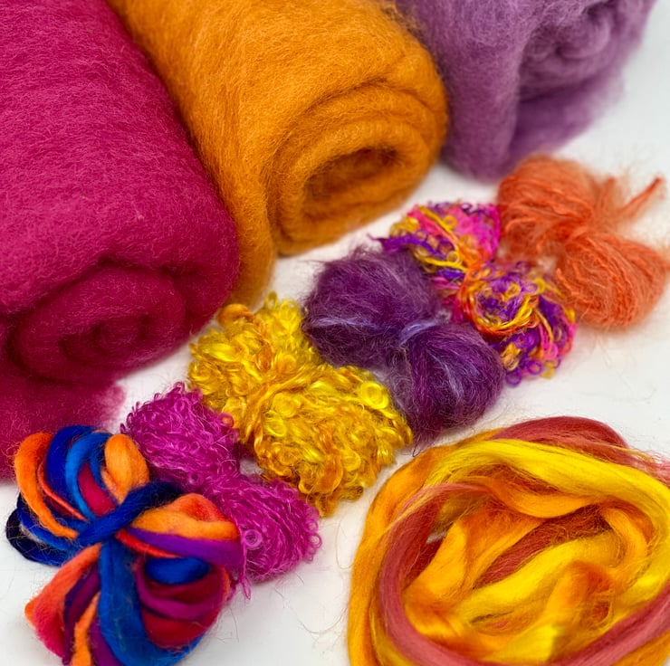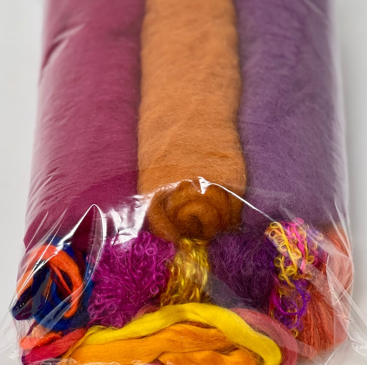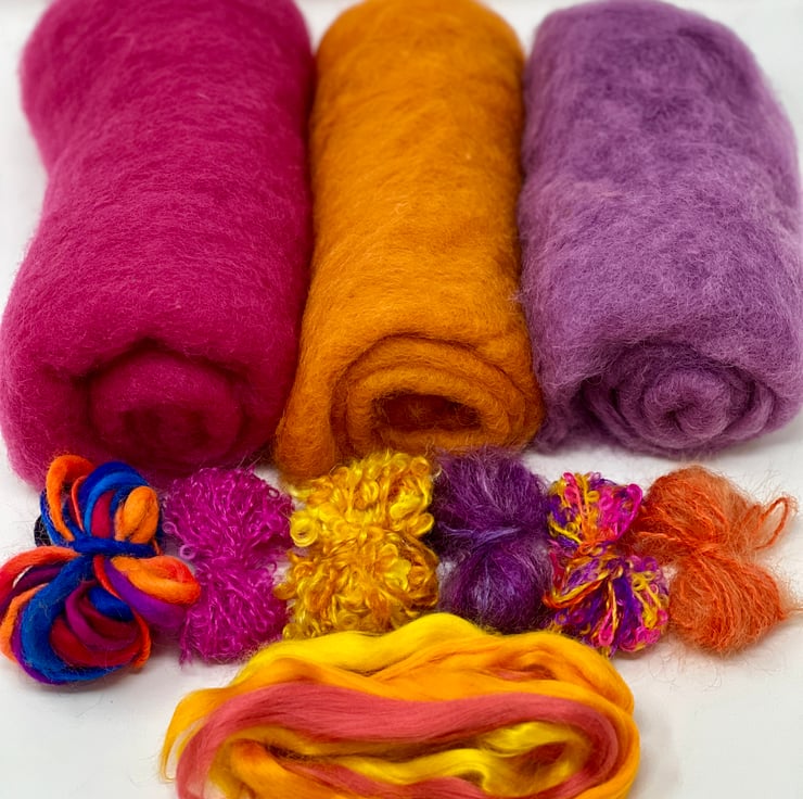 This kit includes all the materials required to make one bowl with an optional turned-over rim (and you will have some materials left over) in a complementary pink, purple and orange colourway with similar coloured wool yarn and bamboo/viscose fibre embellishment highlights. The photos show an example of a bowl made from a similar kit. Please note you will need to purchase your felting on a ball equipment separately (you will need the smaller green felting ball - see separate listing).