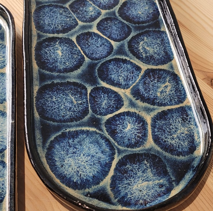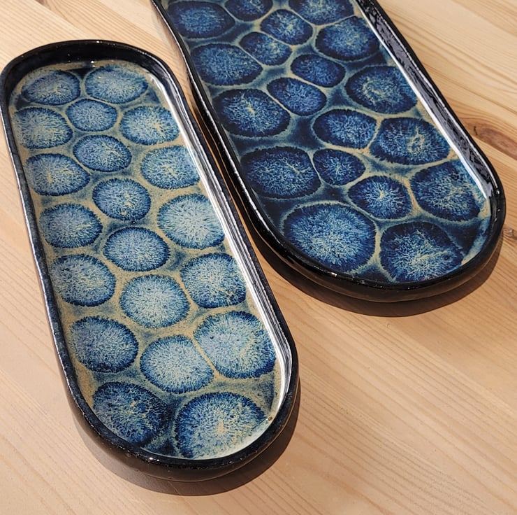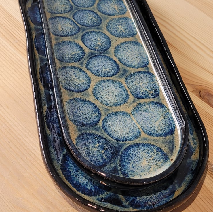 This set of two handmade baguette shaped plates have a patterned blue black glaze on its surface. Their outer surface has a plain blue black glaze covering. The bigger piece has a length 34cm, a width of 14cm and a height of 2.5cm. The smaller piece has a length of 31.5cm, width of 10.5cm and a height of 2.5cm.