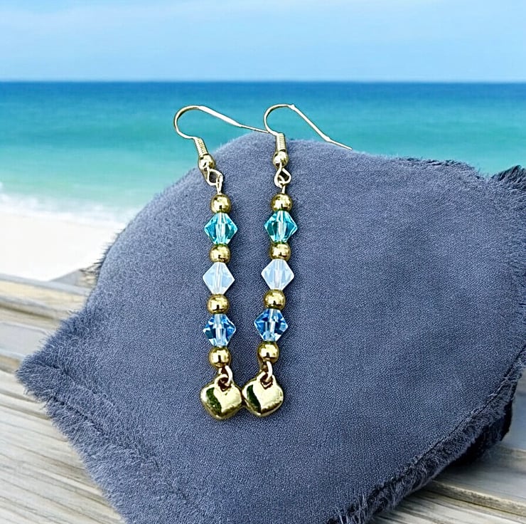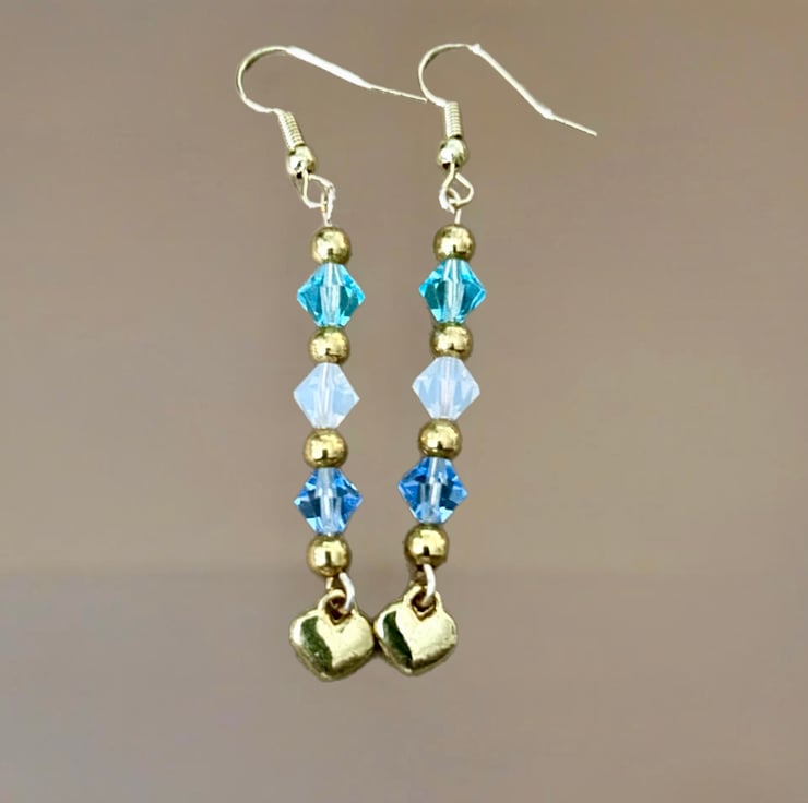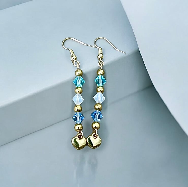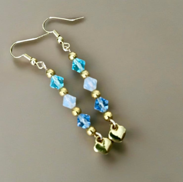 These beautiful earrings are made from super quality tarnish resistant gold plate featuring sparkling 3 bicone cut Preciosa beads, aqua, sapphire and opaque white. Drop is approx 2”. These earrings will compliment any outfit, great for an occasion or for a day out with your friends.