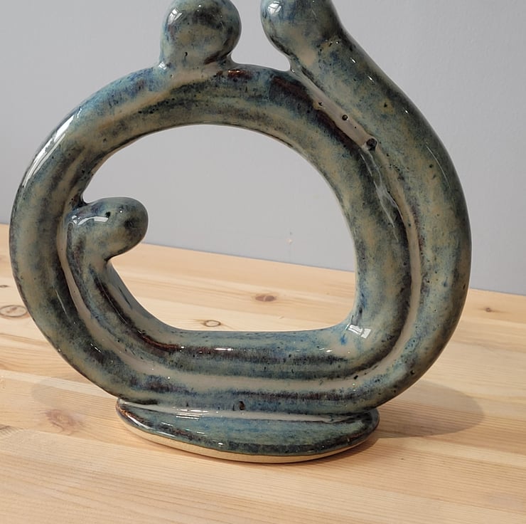 This hand carved sculpture captures a new family with a baby. It is glazed in a blue-green glaze. This piece has a width of 18cm and a height of 18cm.