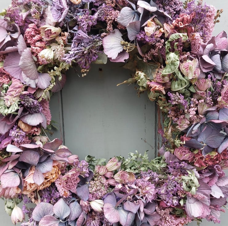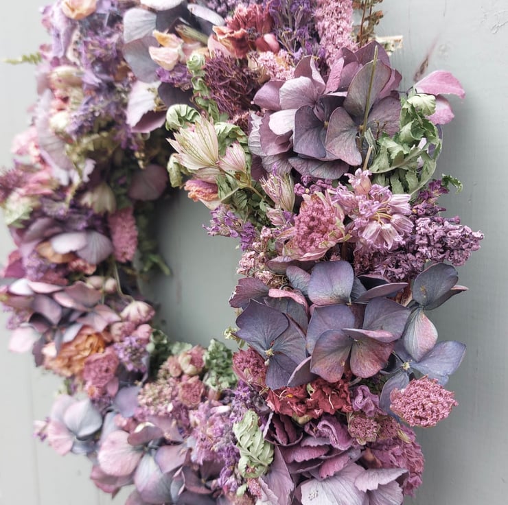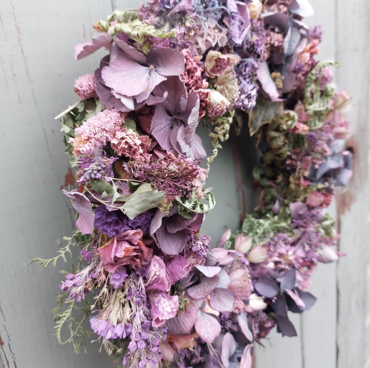 A handmade dried flower wreath measuring approximately 28cm in diameter.