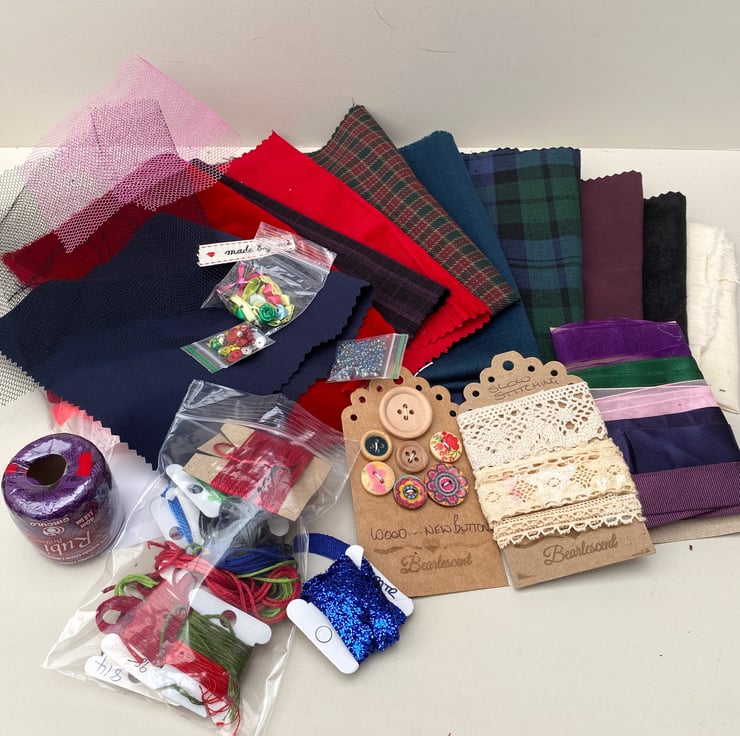 All the beautiful fabrics and supplies I have bought for Bearlescent over the past 11 years and knowing I can never use it all so I decided to make some slow stitched kits. My love of hand sewing and embroidery together with the beautiful trims and buttons in my fabric stash.