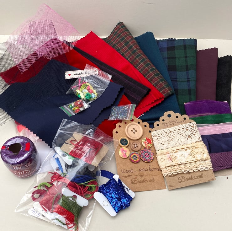 There's a mixture of patterned and plain fabrics in each kit, typical fabrics could be a mixture of Cottons, Poly cotton, Viscose, Silk, Satin, Lace fabric, Mesh, Corduroy, Velvet