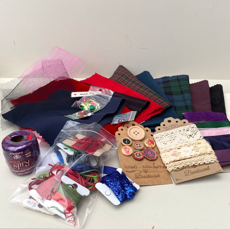 Snippets of fabric, Lace, Ribbons, Cord trim, Beads, Button card (new & vintage)Trims I.e. ribbon roses, wooden beads, threads