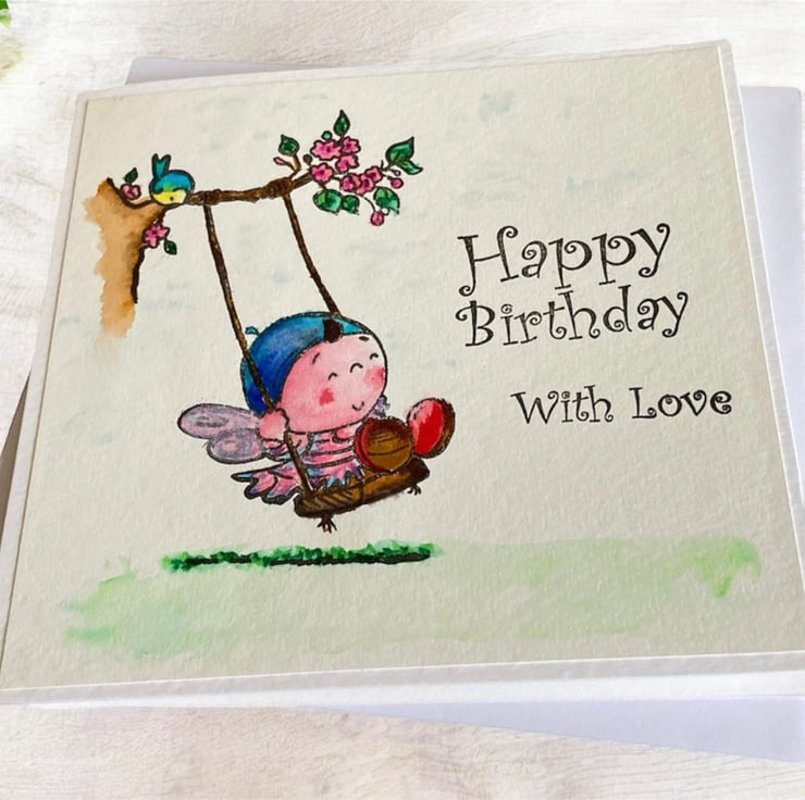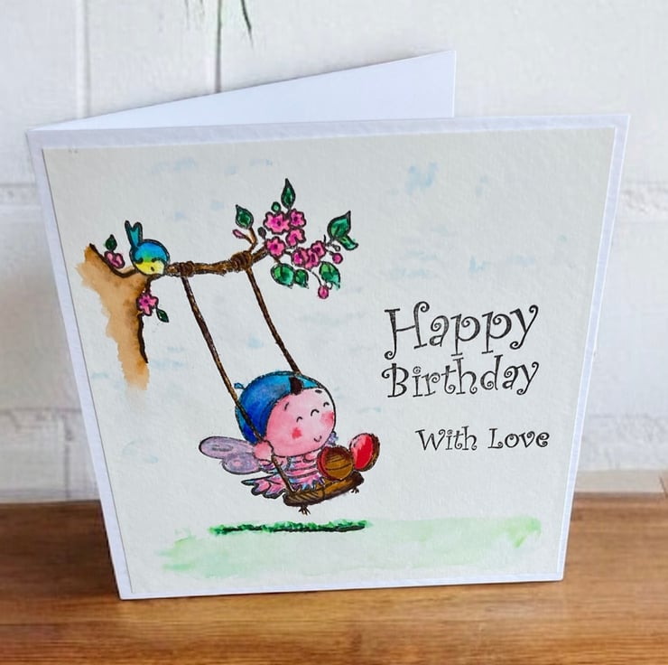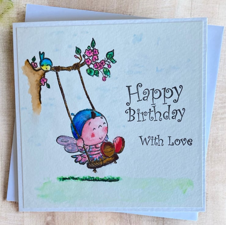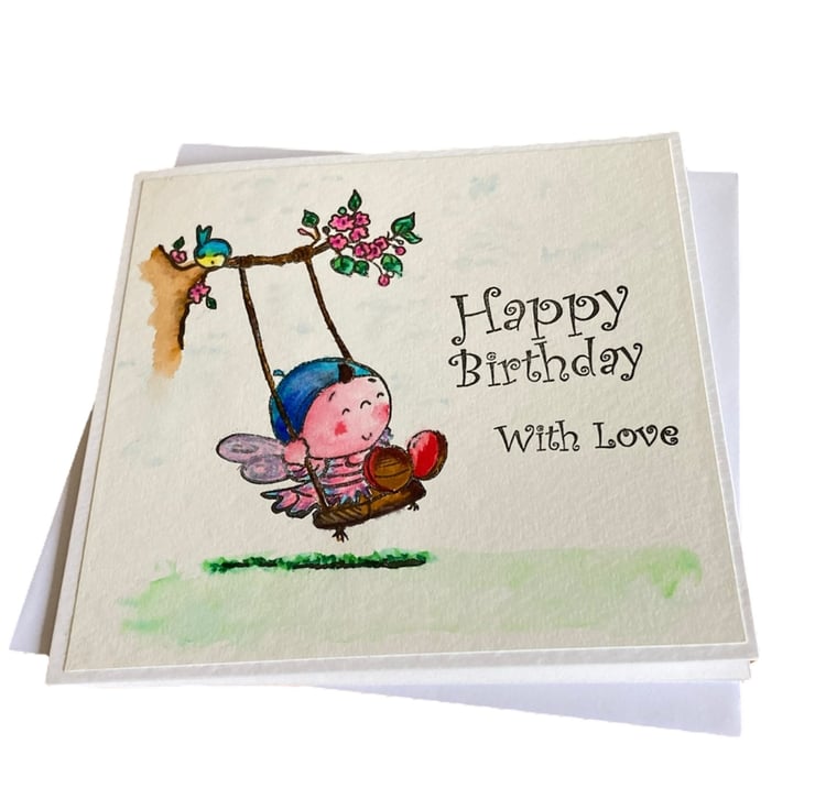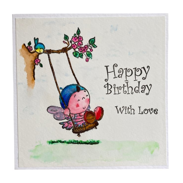 The card has been layered with quality watercolour paper and hand stamped with the image of the fairy on a swing. The image has then been hand painted with watercolour paints. The words Happy Birthday With Love have been added.
