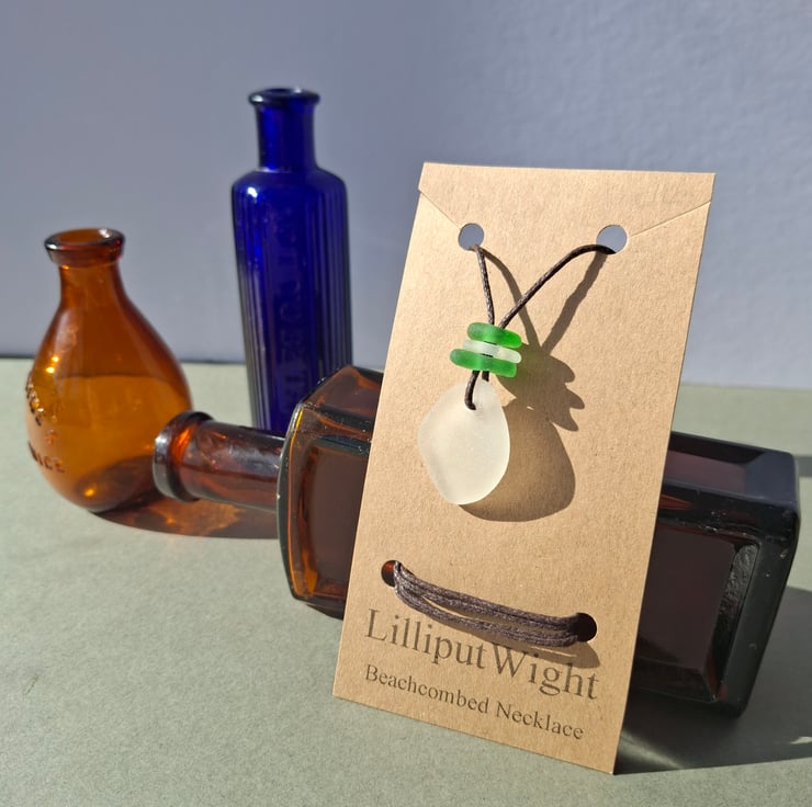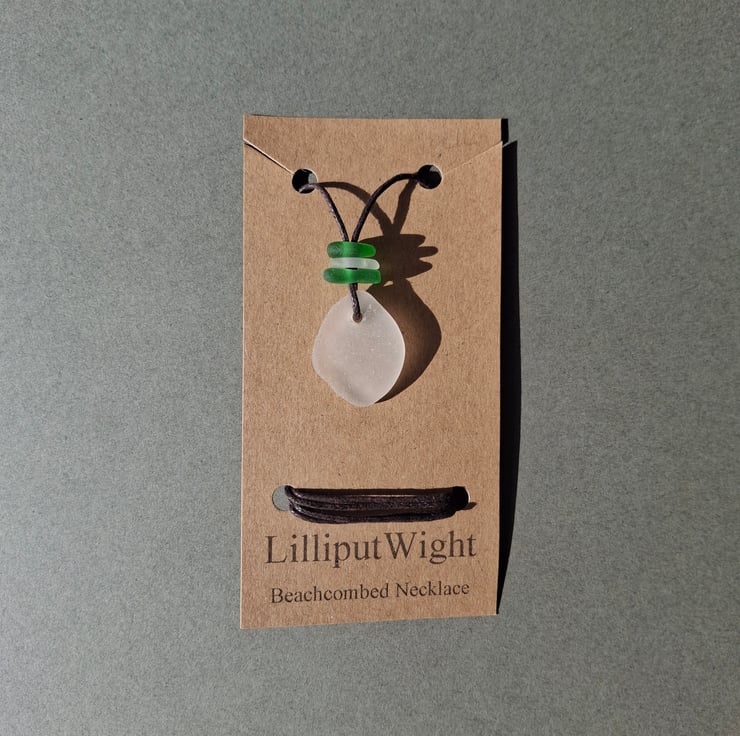 This necklace is made from naturally shaped pieces of sea glass. The sea frosted glass pieces have been suspended from a cord of brown waxed cotton. A pair of sliding knots allow the length of the necklace to be adjustable and yet stay at the desired length.