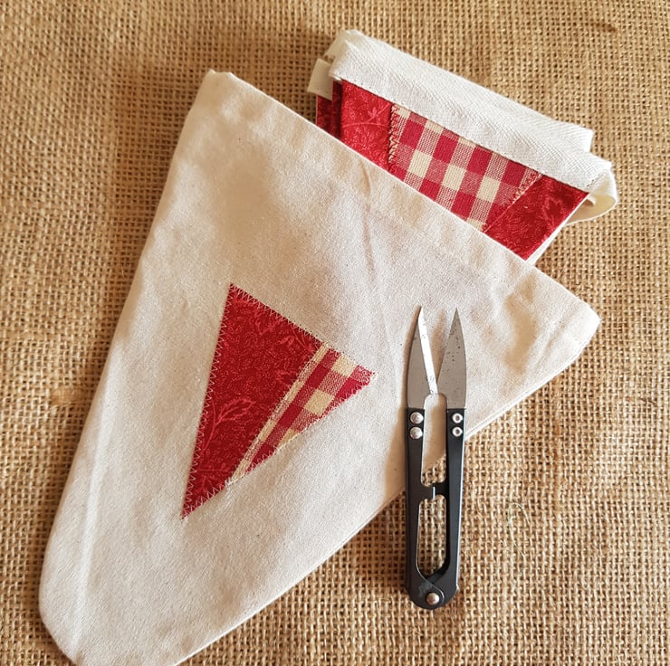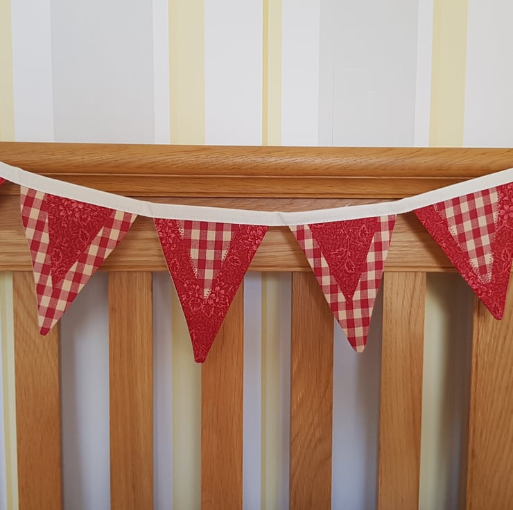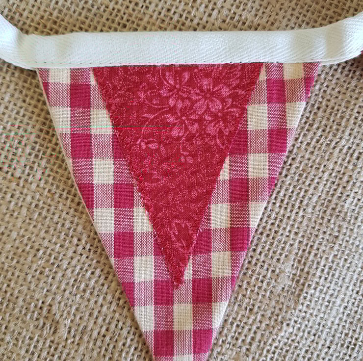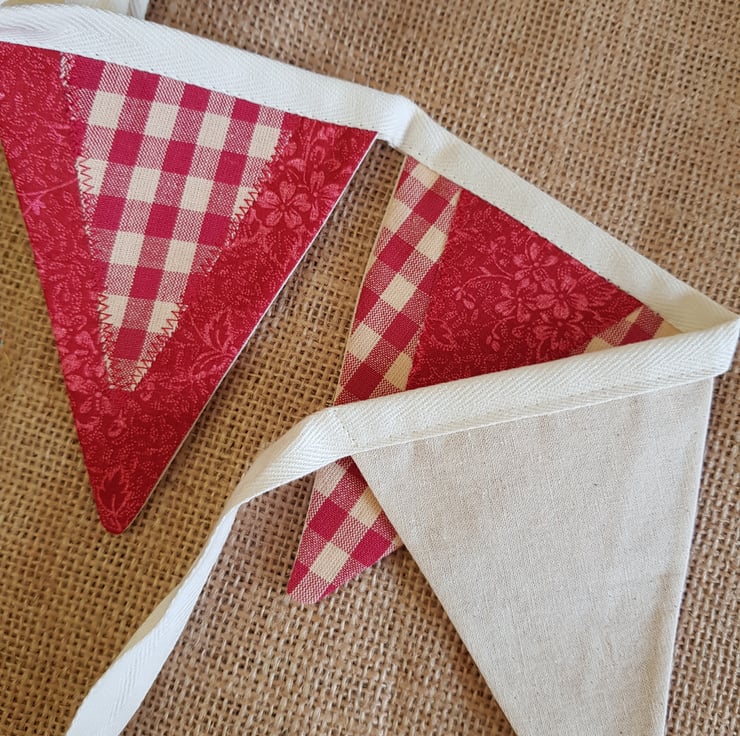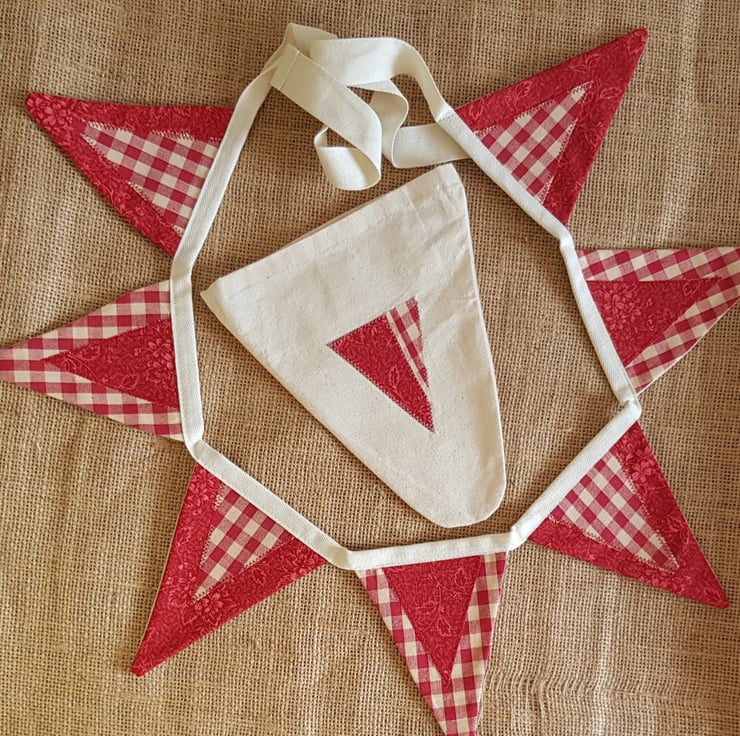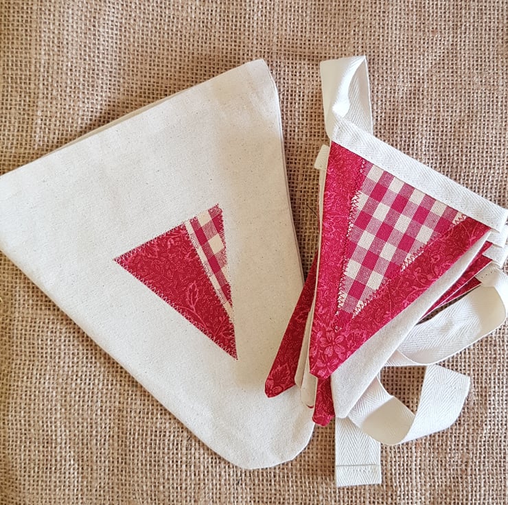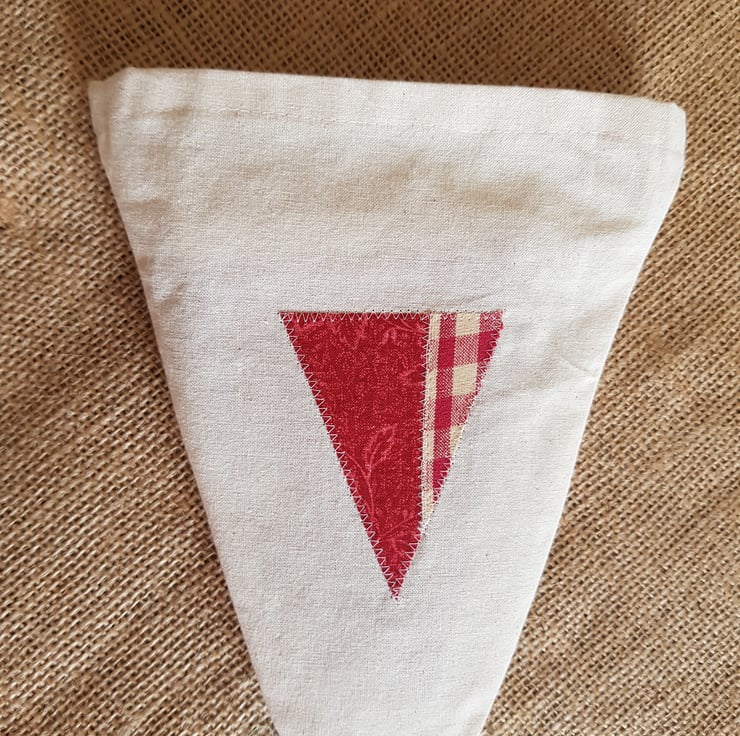 I have chosen coordinating red and cream cotton fabrics. Each penant is backed with calico fabrics and the tape is cotton twill.