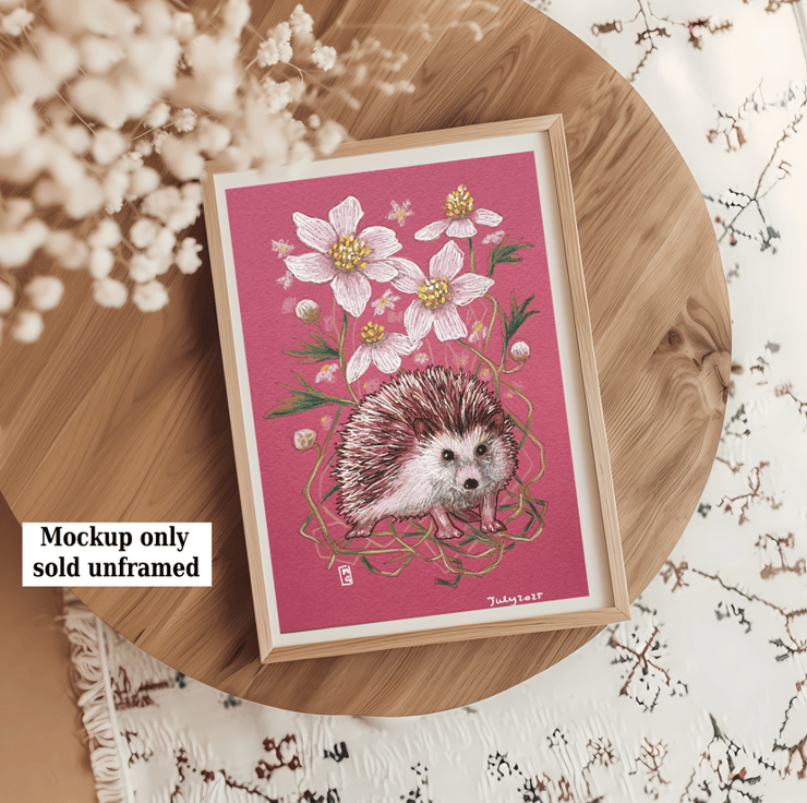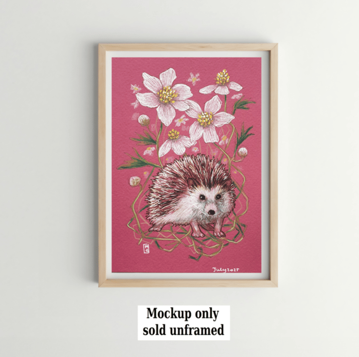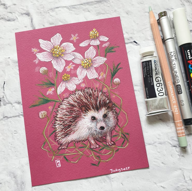 A small colour drawing of a hedgehog with an arrangement of white flowers in the background. The drawing is on dark pink paper.