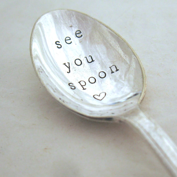 A handstamped vintage silverplated coffee spoon with an art deco style handle and the wording 'see you spoon' in black lettering in the bowl, along with a tiny heart. It's approximately 11.5cm long. A nice little letterbox gift for a friend you haven't seen for a while.