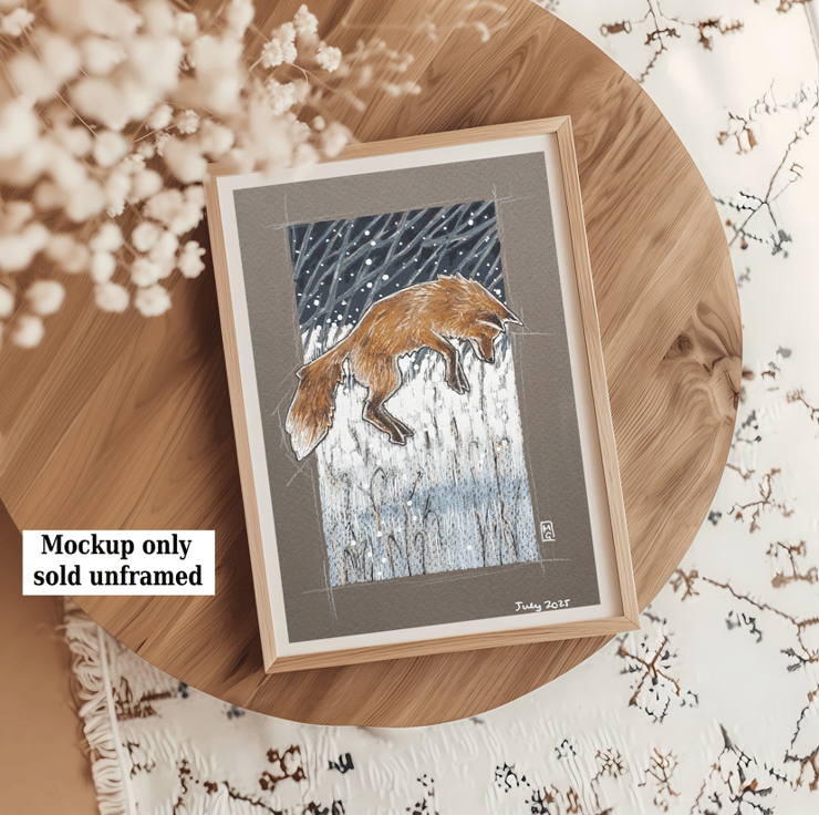 A small colour drawing of a red fox in winter, leaping onto his prey which lies under the snow covered ground. There is a little snow covered night scene in the background of the drawing which is on grey paper.
