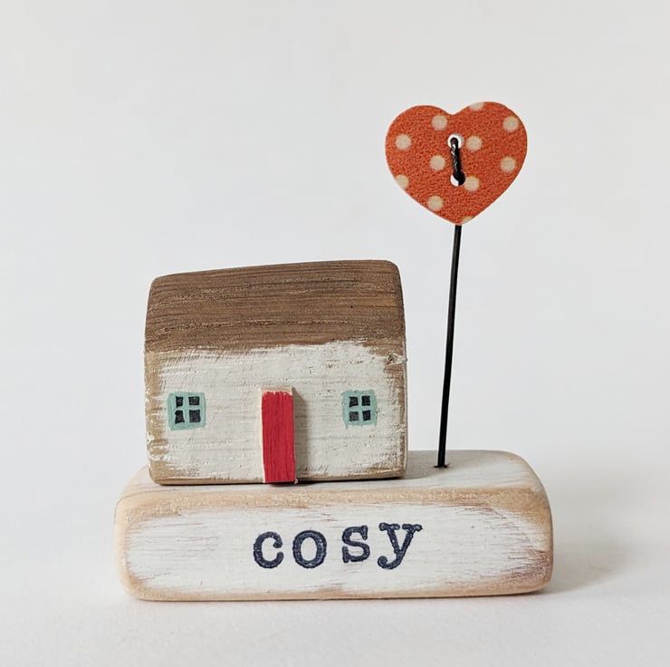 A hand stamped wooden base with a teeny painted house and a jolly heart on a wire to stand beside it.