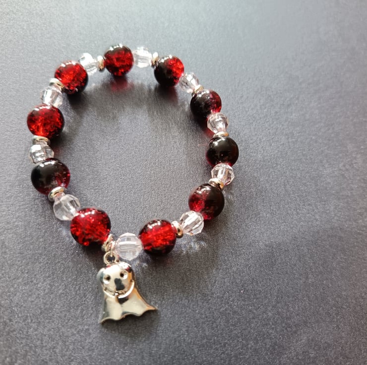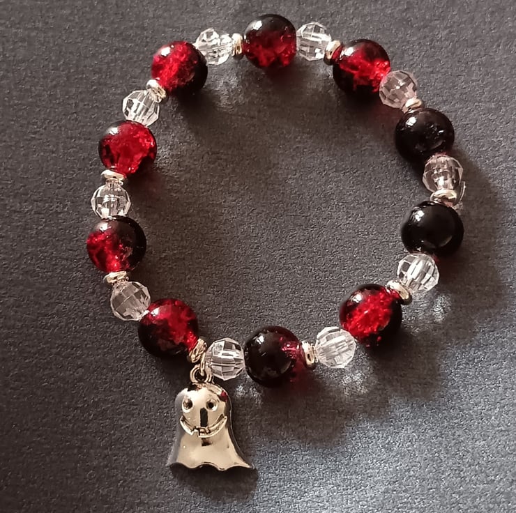 This bracelet measures 7.5 inches and is crafted with red and black beads, clear beads, silver decorative spacers and finished with a silver ghost charm. The item is made using magic stretch elastic