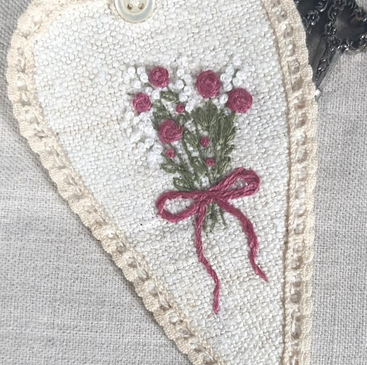 Keep your scissors safe in this pretty case hand embroidered on vintage linen and trimmed with vintage French lace. Measures 10 cm Scissors not included.