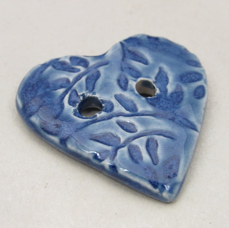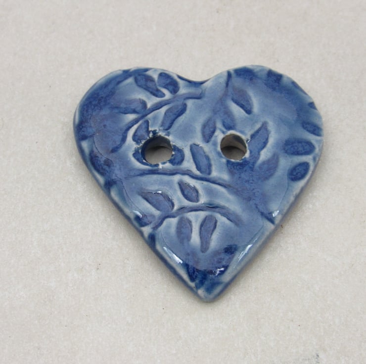 Medium heart shaped stoneware button, textured with a delicate leaf motif.