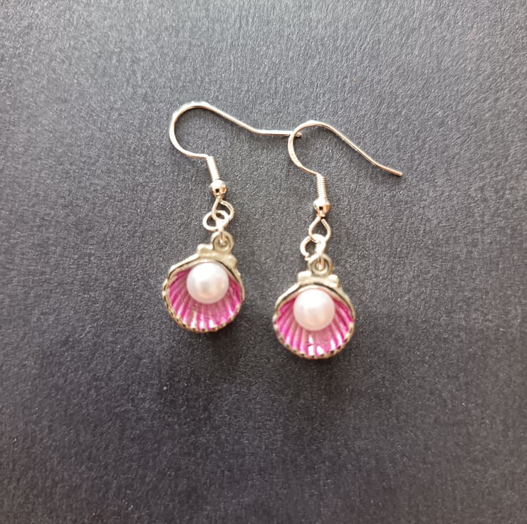 Handmade nautical style dangle earrings crafted with stainless steel hooks and silver pink shell charm with pearl detail.