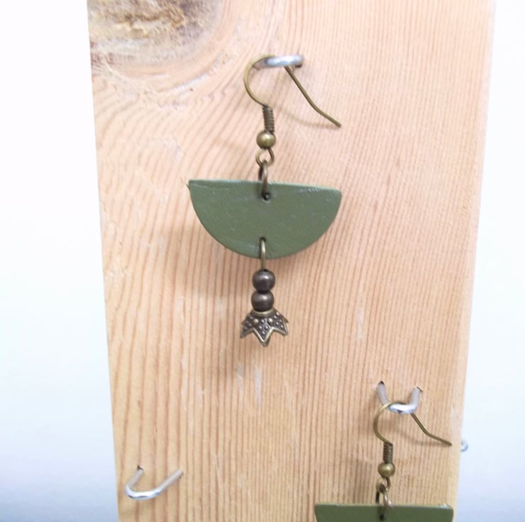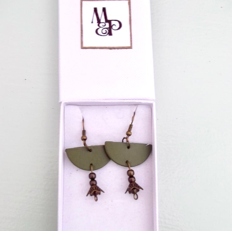 Khaki / dark olive green leather half moon with a gunmetal old gold colour round beads and floral head drop / dangle.
