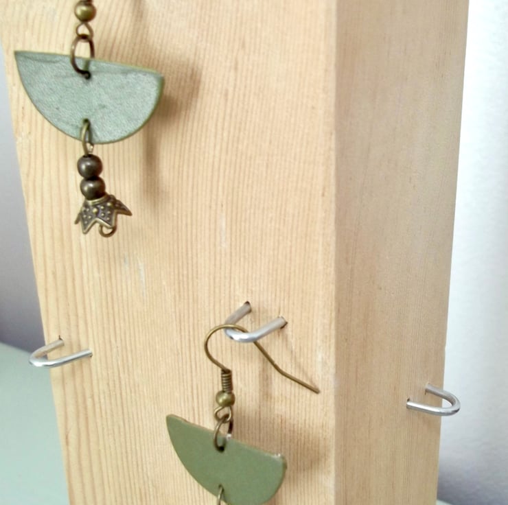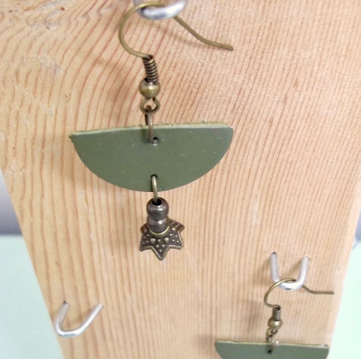 Leather Earrings Khaki Green Leather and Metal Bead Boho Style Half Moon