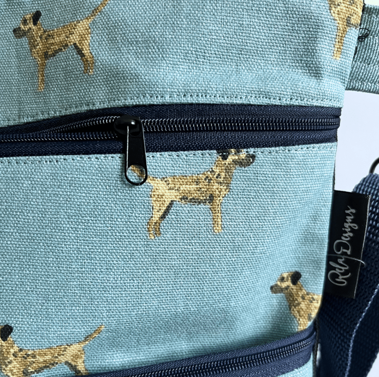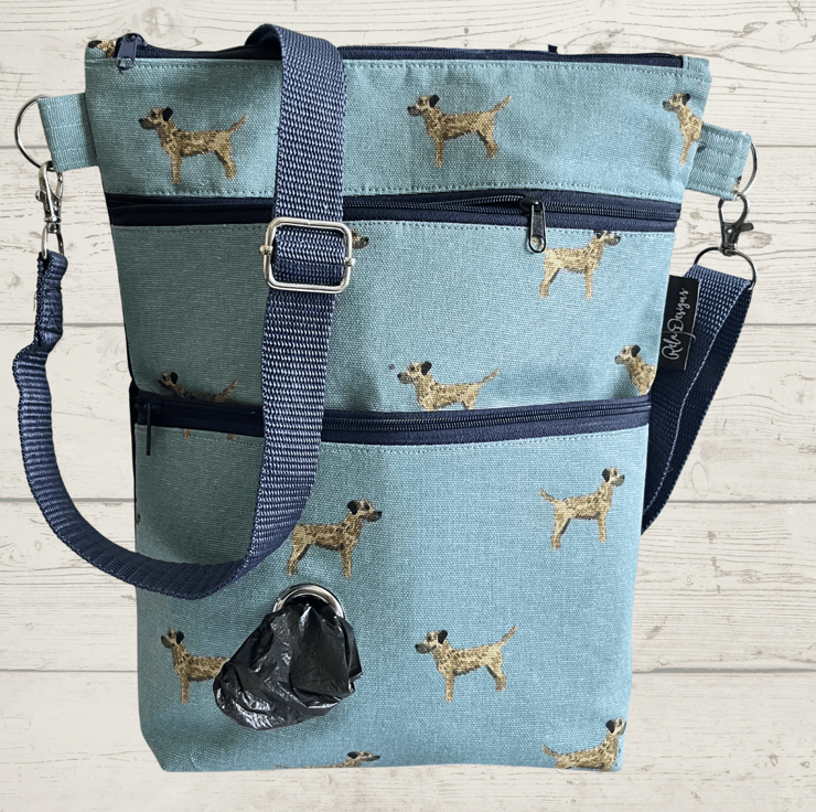The bag is made from a beautiful linen cotton featuring the cutest border terriers with a black waterproof back and lined throughout with high-quality waterproof fabric to keep your belongings safe and dry.