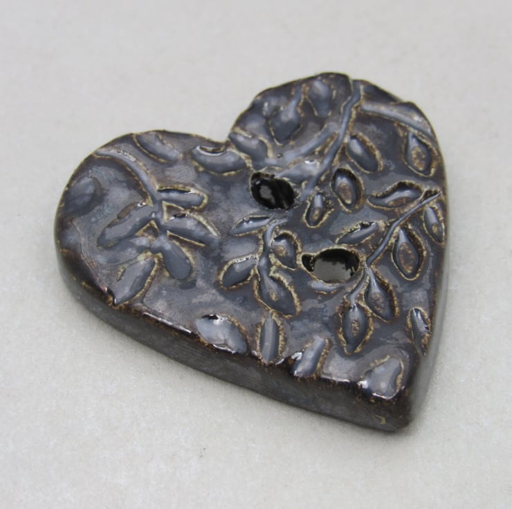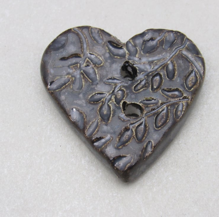 Medium heart shaped stoneware button, textured with a delicate leaf motif.
