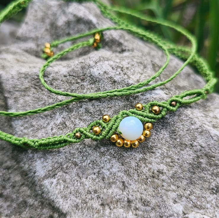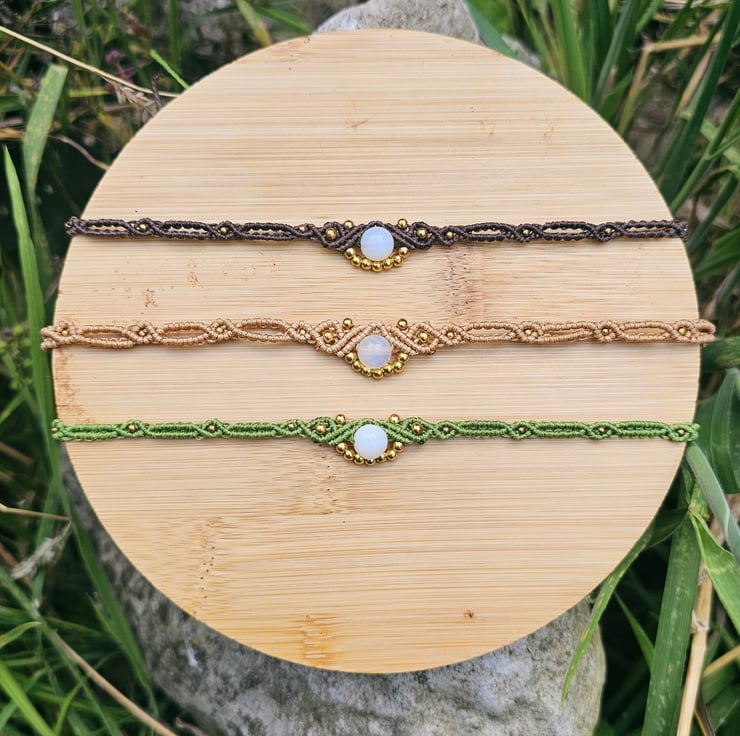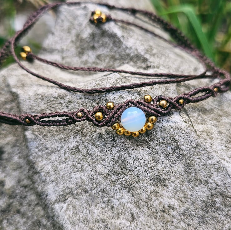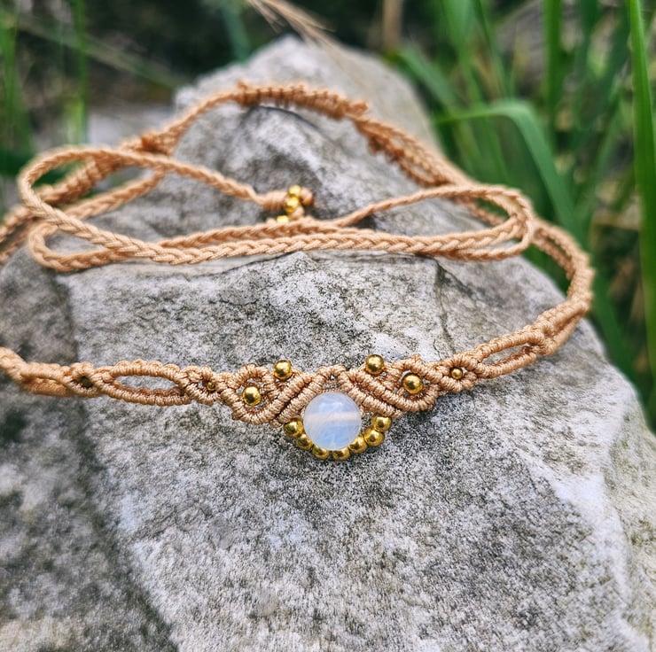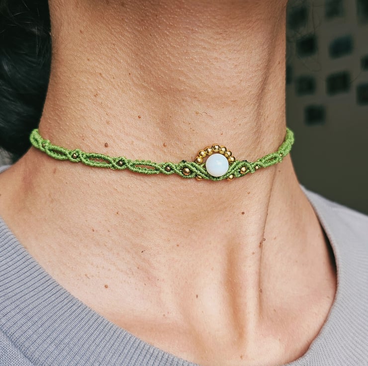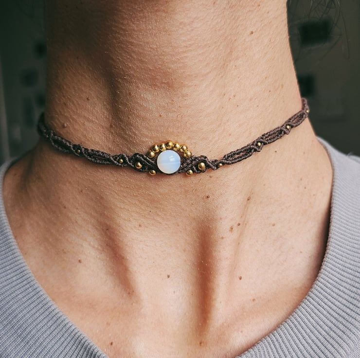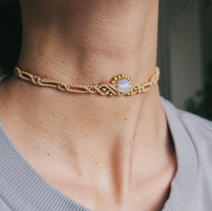 Handmade boho macrame choker available in dark brown, beige, and olive green. Each piece features delicate gold seed beads and a natural moonstone charm known for its calming and balancing energy. Adjustable and lightweight, perfect for adding an earthy, mystical vibe to your outfit. Choose your colour and feel the gentle power of moonstone with every wear.