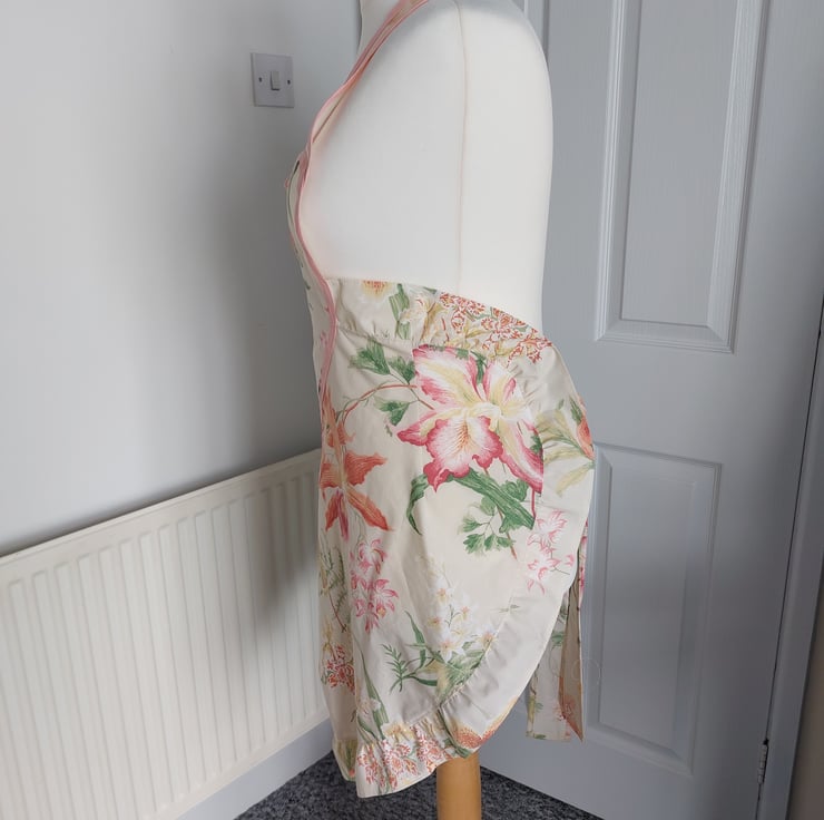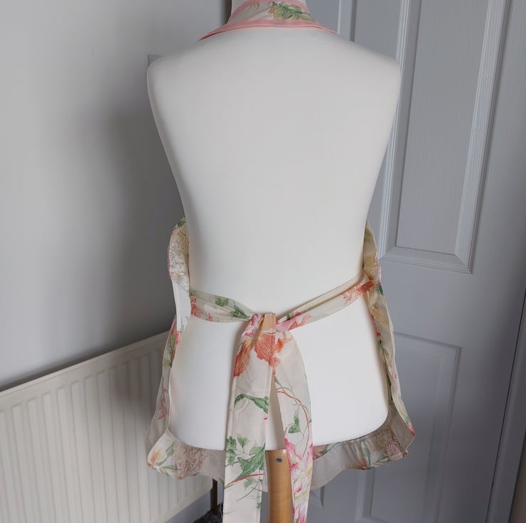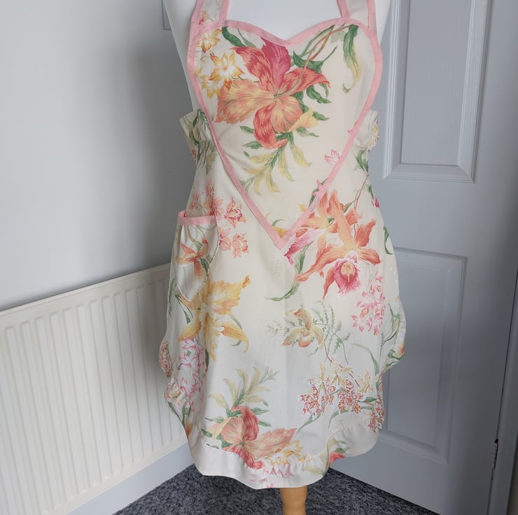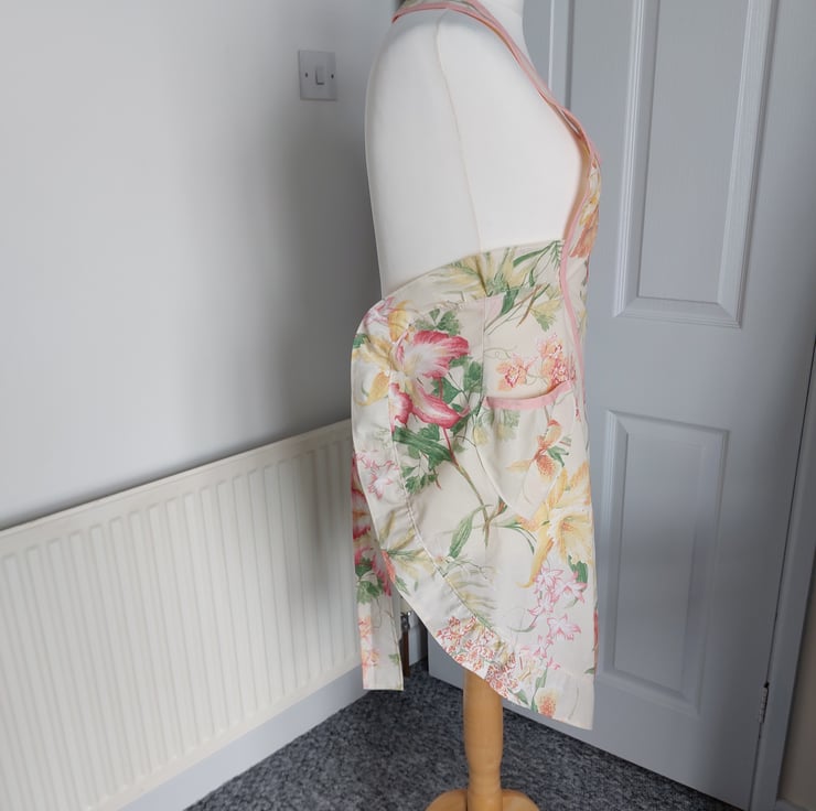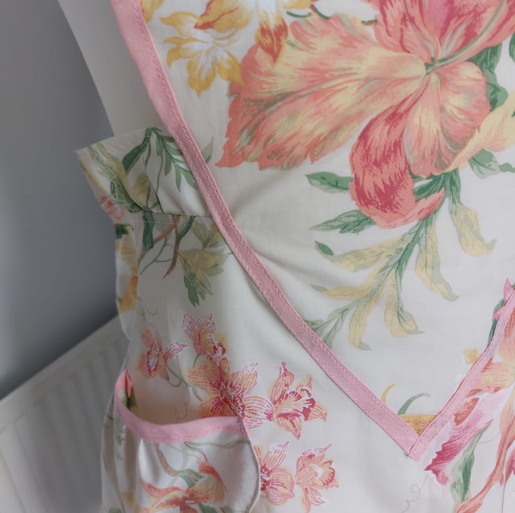 Handmade using a vintage floral fabric and a coral cotton bias trim