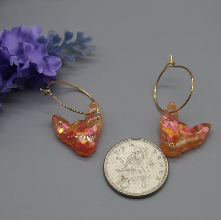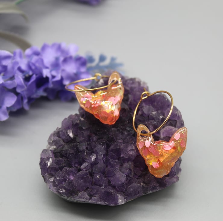 These super cute sphynx cat earrings have been made with epoxy resin and gold plated stainless steel hoops.