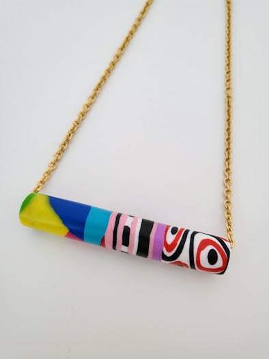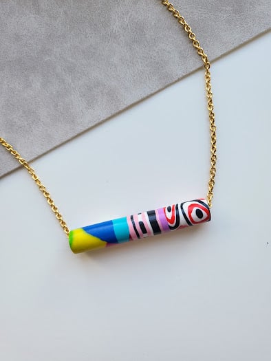 Elevate your everyday style with our 'Urban Pulse Necklace,' a wearable piece of contemporary art. Expertly handcrafted from durable polymer clay, this striking bar-shaped pendant features a dynamic fusion of vibrant hues – passionate reds, electric blues, soft pinks, and bold blacks – arranged in an intricate, abstract mosaic. Each facet of the design reveals a unique pattern, creating a fascinating visual rhythm that catches the eye. Suspended from a sleek silver-tone chain, this lightweight necklace adds a sophisticated pop of colour and modern flair to any outfit. It's the perfect accessory to express your unique style and artistic sensibility.