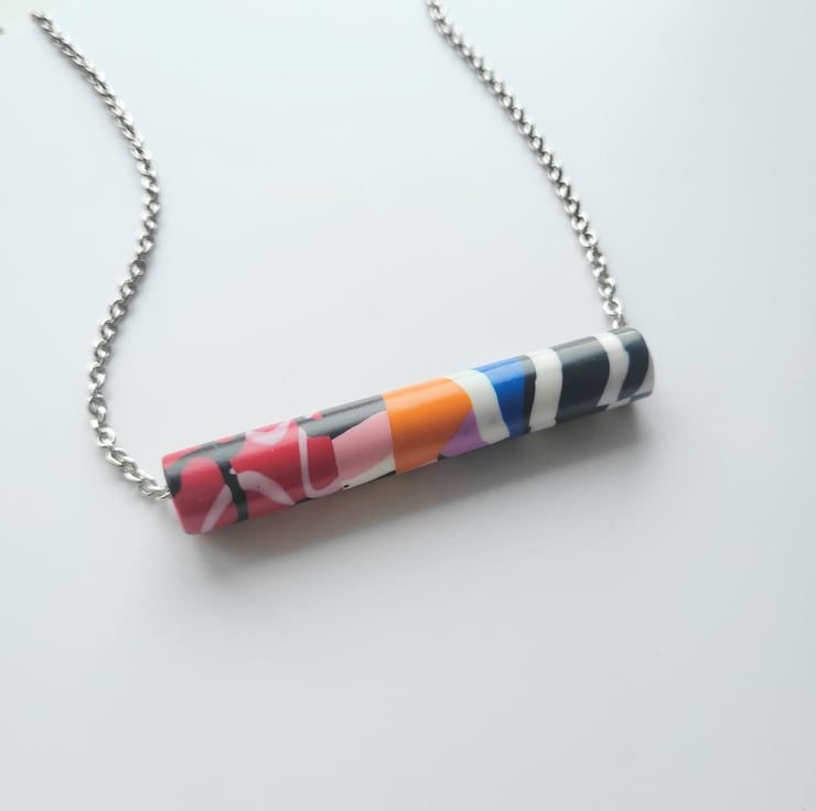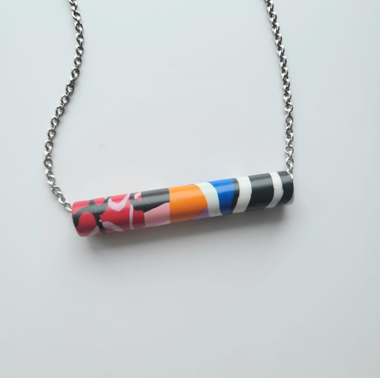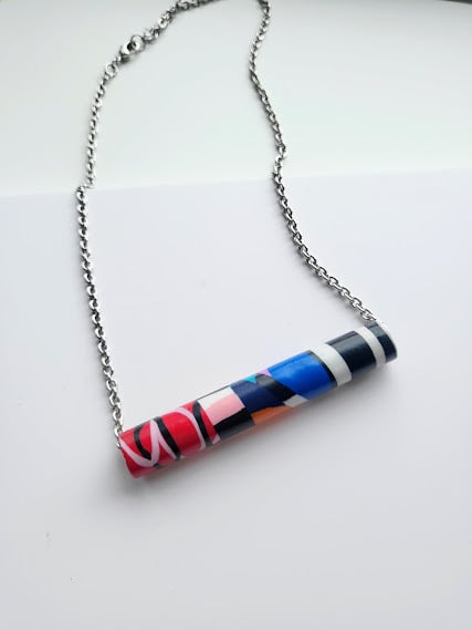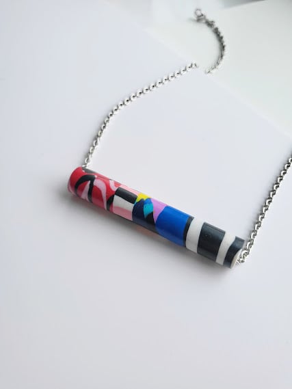 Inject a dose of pure joy and artistic charm into your look with our 'Playful Whimsy Necklace.' This delightful bar pendant, meticulously hand-formed from high-quality polymer clay, showcases a lively blend of cheerful colours and captivating patterns. Bold pink and sunny yellow sections contrast beautifully with classic black stripes, while whimsical red and black swirls dance across a clean white background. Suspended from an elegant gold-tone chain, this lightweight and unique necklace is perfect for adding a touch of imaginative flair and modern fun to any outfit. It's a true conversation starter that celebrates creativity and individuality.