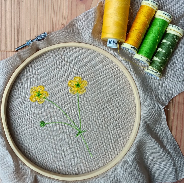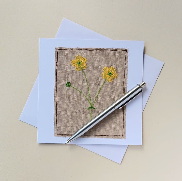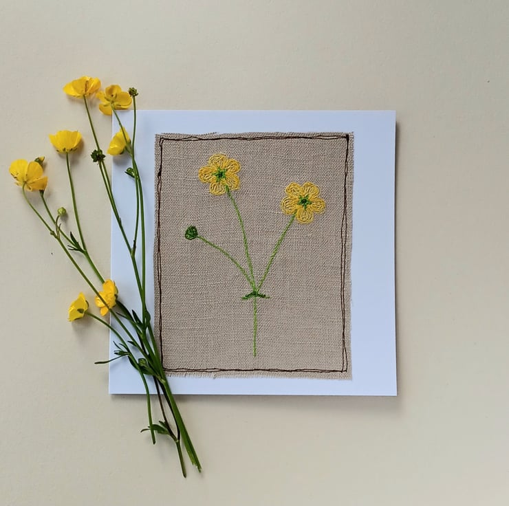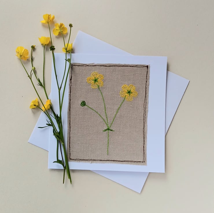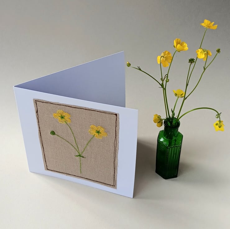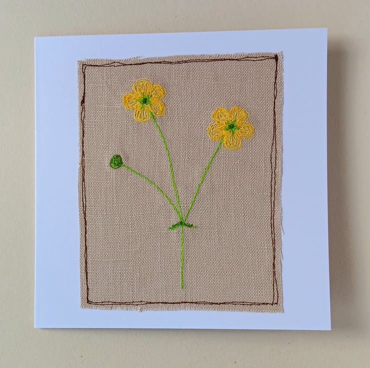A beautiful card depicting a buttercup spray from the hedgerow. It is sewn onto beige linen using free motion embroidery. I use four different colours of thread to create depth and detail. The linen is then sewn straight onto recycled card. It measures 14cm square and comes with a white envelope. Inside is left blank for your own message.