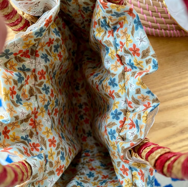 With its gorgeous flowery outer decoration, this cute little handbag was just crying out for a pretty adornment to bring it back into service. So now there is a new cotton ditsy floral lining sewn into place with a lacy frill around the top.
