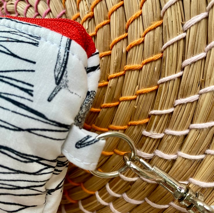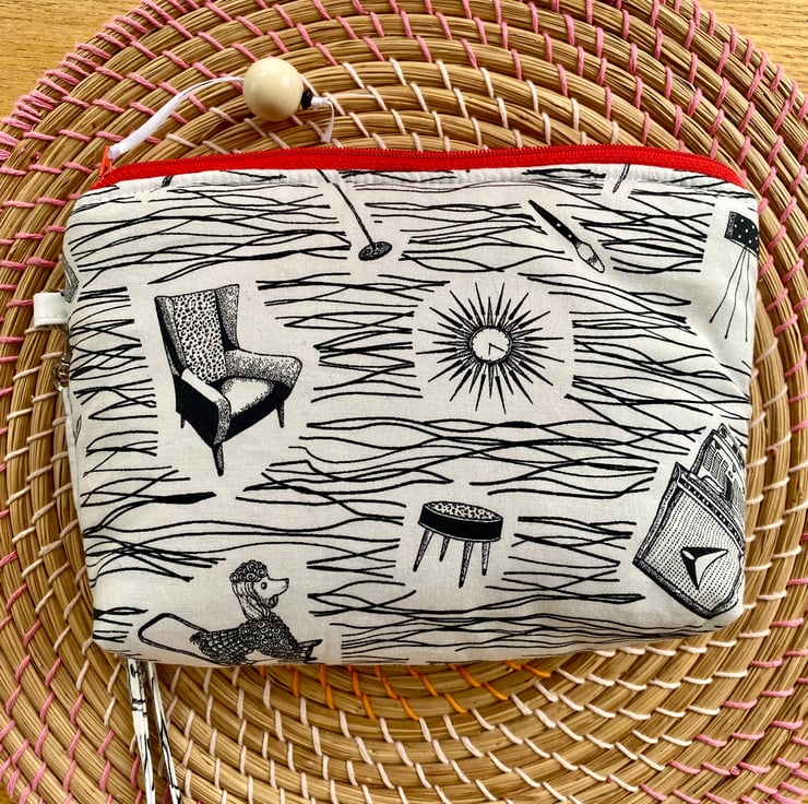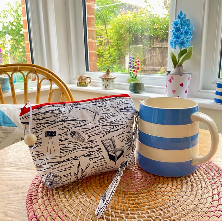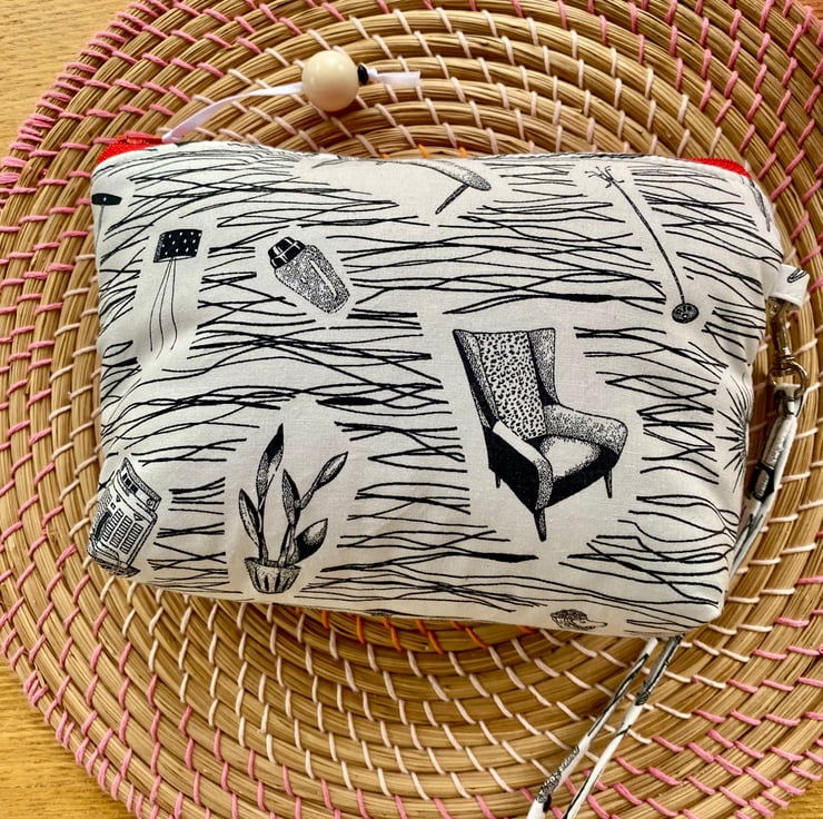 Handmade zipped clutch or purse in ‘Homemaker’ style fabric with wrist strap
