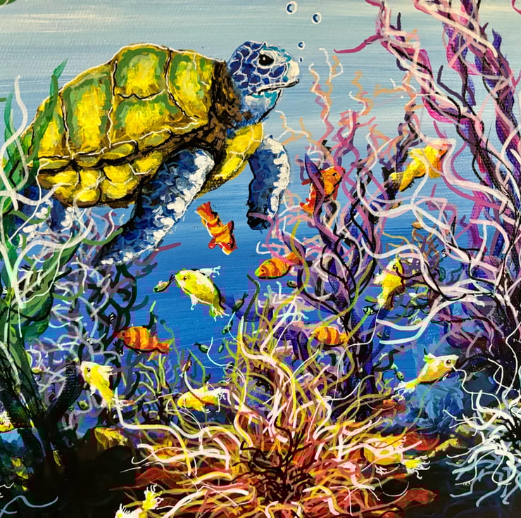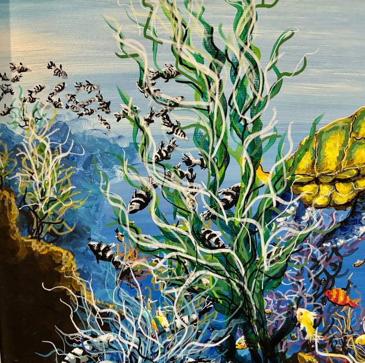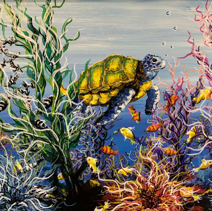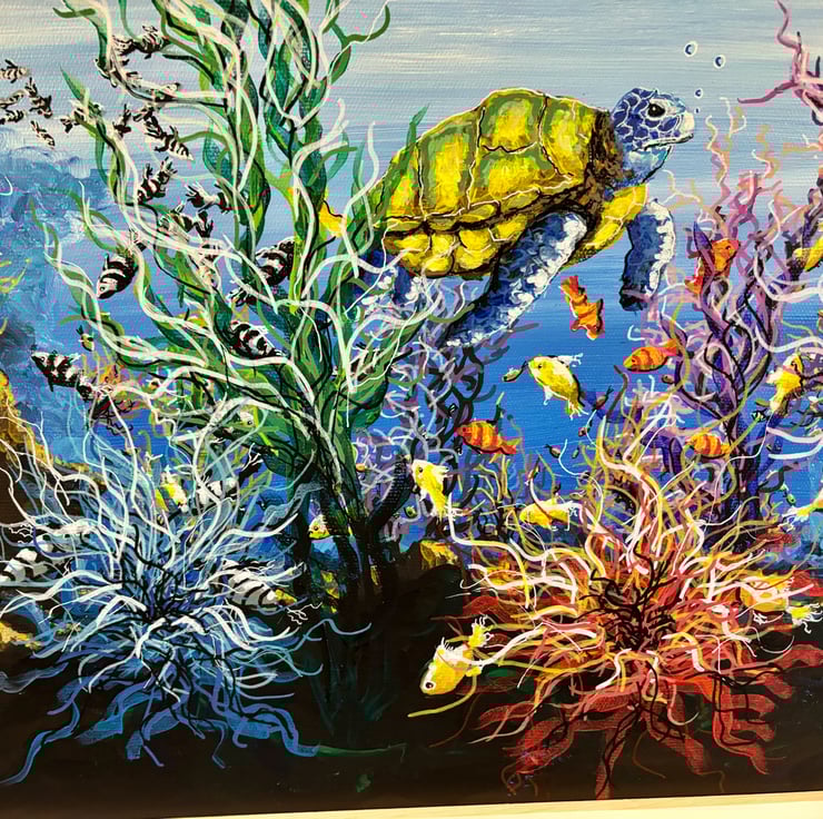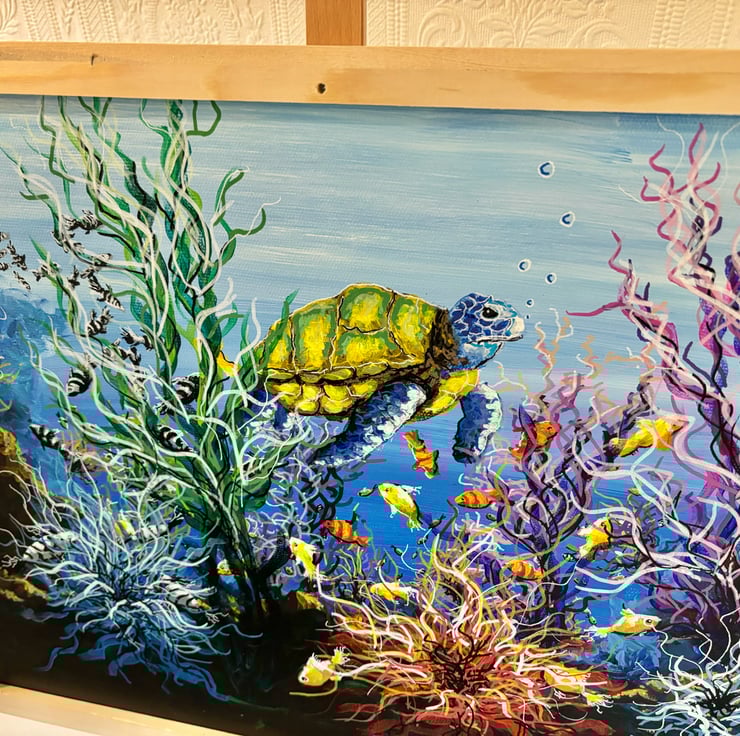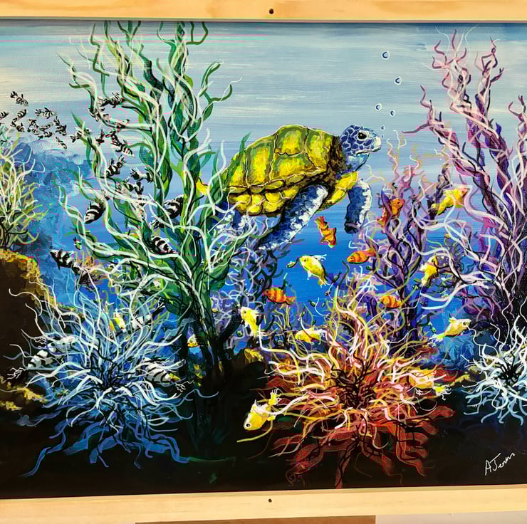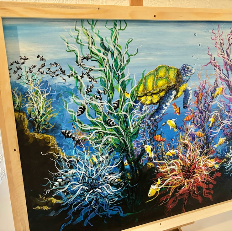 A hand painted original signed acrylic painting with wood frame by Andrew Jenkins