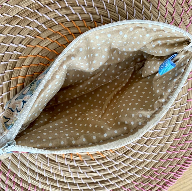Made from William Morris Strawberry Thief fabric with a different bird each side this lovely Toots Totes “Zinnia” purse has a beige spotty cotton lining and a coordinating zip and beaded zip pull.