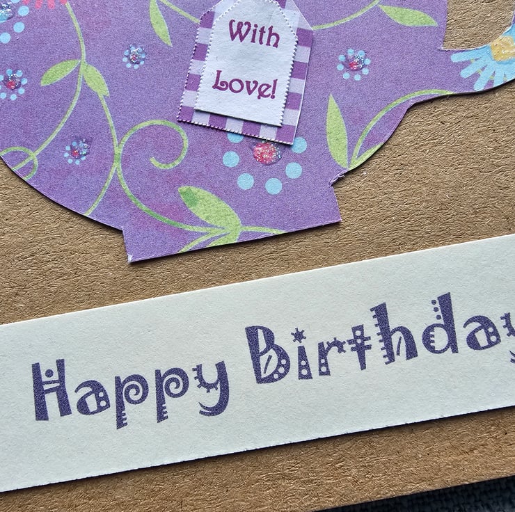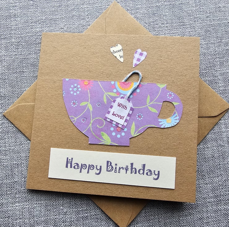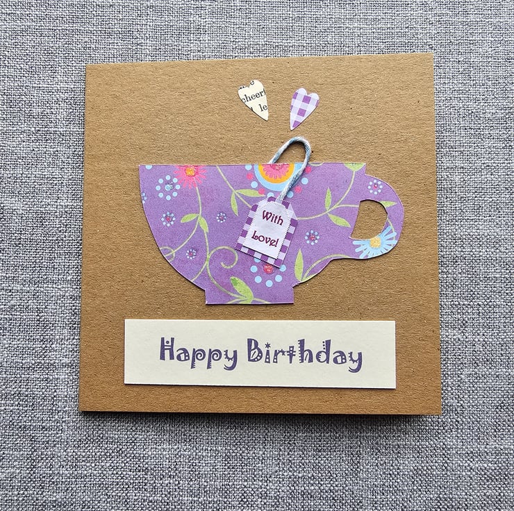 A simple colourful handmade birthday card made using a brown kraft card patterned papers and baker's twine. The words "With Love" are printed on the little tea bag label. The greeting is printed in fancy letters on quality cream card. The card is finished with 2 little heart shapes.
