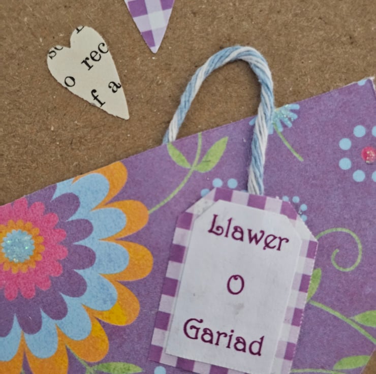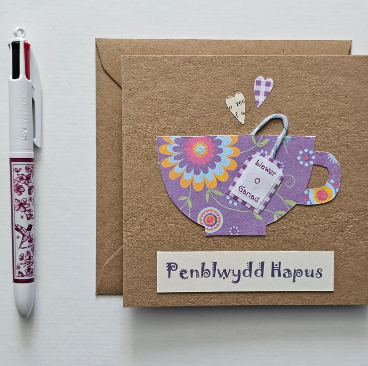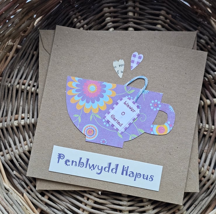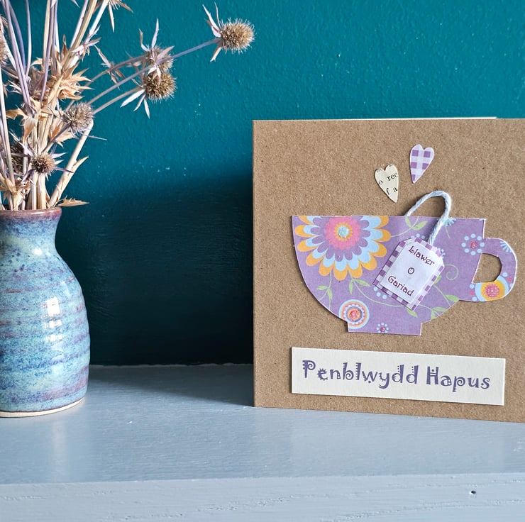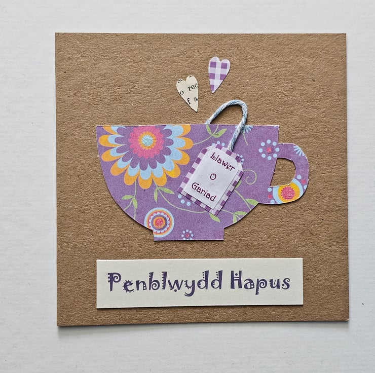 The card is made using a brown kraft card patterned papers and baker's twine. The words "Llawer o gariad"(lots of love) are printed in purple on the little tea bag label. The greeting is printed in fancy letters on quality cream card. The card is finished with 2 little heart shapes.