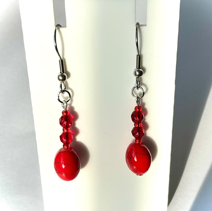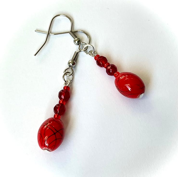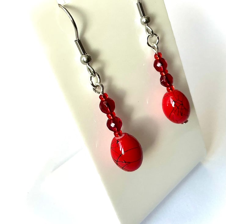 Beaded drop earrings featuring a larger bright red glass bead with random black line markings.